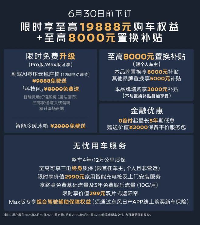 东风日产N7 Pro版/Max版可享限时免费升级副驾AI零压云毯座椅(12向电动调节)、科技包(智能灵动灯语系统,魔法画布;主驾双通道头枕音响;双升降扬声器)、智能冷暖冰箱。至高8000元置换补贴(限个人车主),本品牌置换享8000元补贴,其他品牌置换享5000元补贴,本品牌增购享3000元补贴(不与置换补贴叠加享受)。0首付起最长5年期低息、赠送价值2000元保费平价服务包。