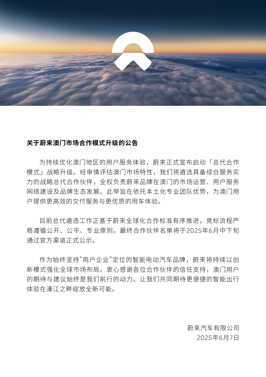 6月9日,蔚来汽车宣布启动澳门市场的「总代合作模式」战略升级。蔚来广州区域公司总经理王泰在蔚来App发布公告,表示为了优化澳门地区的用户服务体验,蔚来将遴选具备综合服务实力的战略总代合作伙伴,全权负责蔚来品牌在澳门的市场运营、用户服务网络建设及品牌生态发展。这一举措旨在利用本土化专业团队优势,为澳门用户提供更高效的交付服务与更优质的用车体验。