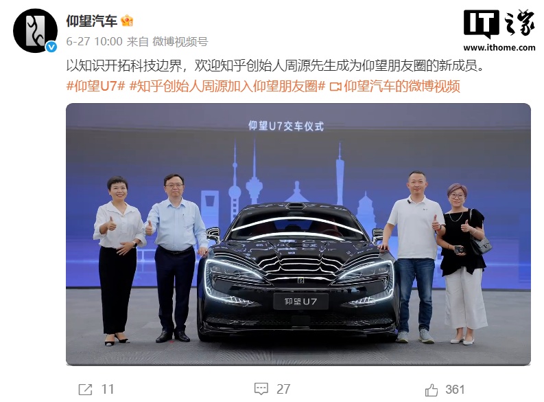 6月30日,仰望汽车官方披露,知乎创始人周源成为仰望U7的新车主。比亚迪董事长王传福亲自出席交车仪式,将车钥匙交付给周源。仰望U7于6月12日开启交付,今年3月上市,定位为“百万级新能源旗舰轿车”。作为仰望品牌的第三款车型,U7搭载了多项高端技术,包括天神之眼A-高阶智驾三激光版、云辇-Z智能悬浮车身控制系统、易四方四电机系统等,提供四座及五座两种座椅布局,并有纯电及插电混动两种动力类型可供选择。