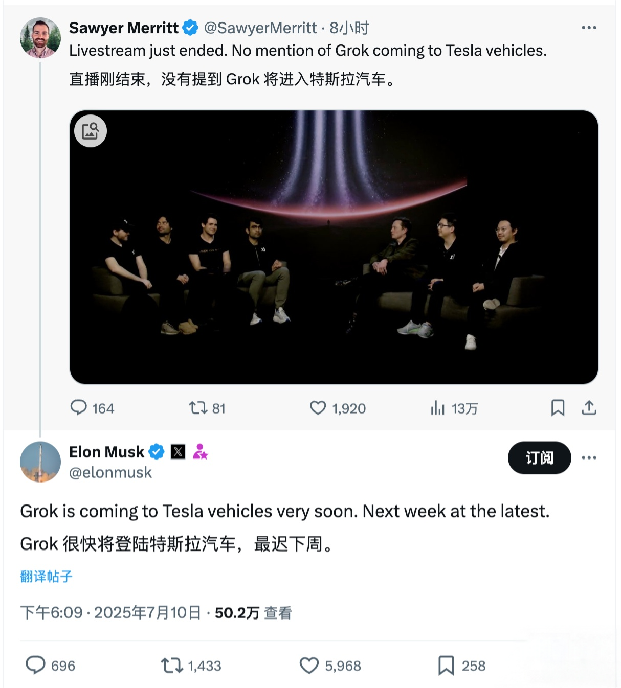 马斯克在社交平台宣布,Grok AI助手将很快登陆特斯拉汽车,预计最晚下周上线。在直播中,马斯克与xAI团队成员介绍了Grok 4在语音功能和性能方面的多项升级,定位为可与OpenAI和