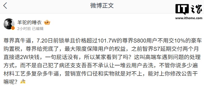 此次政策调整对尊界S800汽车用户产生影响。据透露,7月20日前锁单且价格超过101.7万元的尊界S800用户将不用交10%的豪车购置税。鸿蒙智行App的准车主/车主交流中,部分地区销售人员已发布相关通知,明确7月19日23:59:59前下定的客户不受豪车税影响。