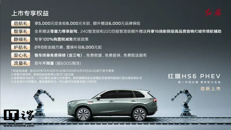 12月16日,红旗HS6 PHEV车型正式上市,起售价为17.88万元。新车提供145智混版、240智混版和220四驱智混版三种配置,价格分别为17.88万元、19.88万元和22.88万元。购车可享多重优惠,包括5000元定金抵8000元车款,额外赠送6000元品牌保险等。红旗HS6 PHEV的长宽高分别为4925*1970*1740mm,轴距达到2925mm。