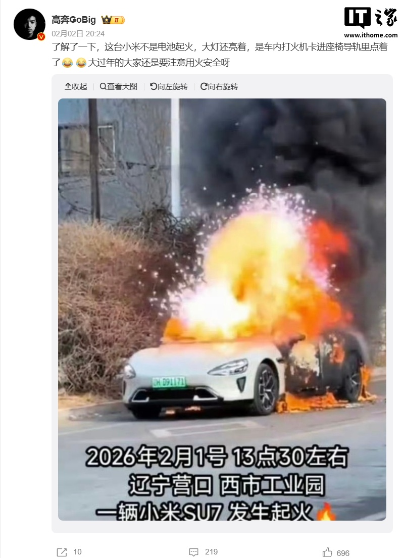 2月1日,辽宁省营口市发生一起小米SU7车辆起火事件。据消防救援部门到场后迅速扑灭,现场无人员受伤。经车主确认,事故原因为车内遗留火源引燃周边可燃物所致,非车辆自身原因产生。网传视频中所谓的“烟花”情况,实为车辆安全气囊因燃烧引爆导致,与