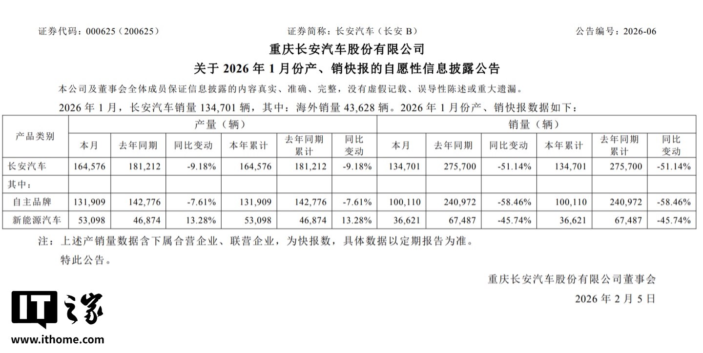 2月4日,长安汽车发布最新产销数据。2026年1月,长安汽车产量为164,576辆,较去年同期下降9.18%。销量方面,1月共销售134,701辆,其中海外销量为43,628辆,同比大幅下降51.14%。自主品牌销量为10.01万辆,同比下降58.46%;新能源汽车销量为36,621辆,同比下降45.74%。