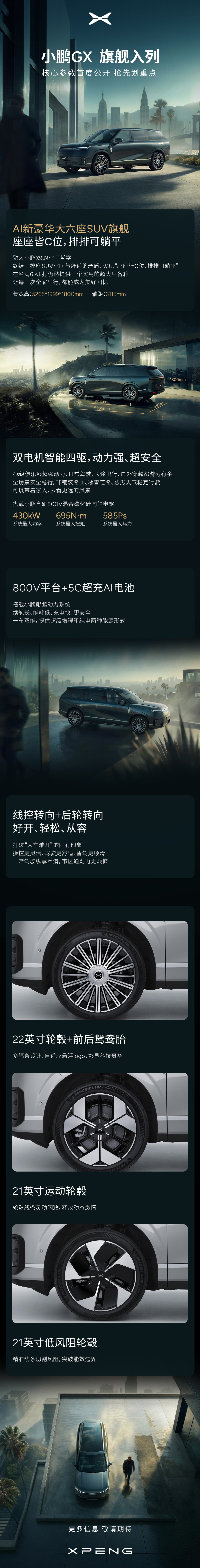 电池技术,支持超级增程和纯电两种能源形式,满足不同用户的能源需求。此外,小鹏GX还配备了线控转向和后轮转向功能,搭载22英寸轮毂和前后鸳鸯胎,多辐条设计和自适应悬浮logo,提升了车辆的操控性和科技感。