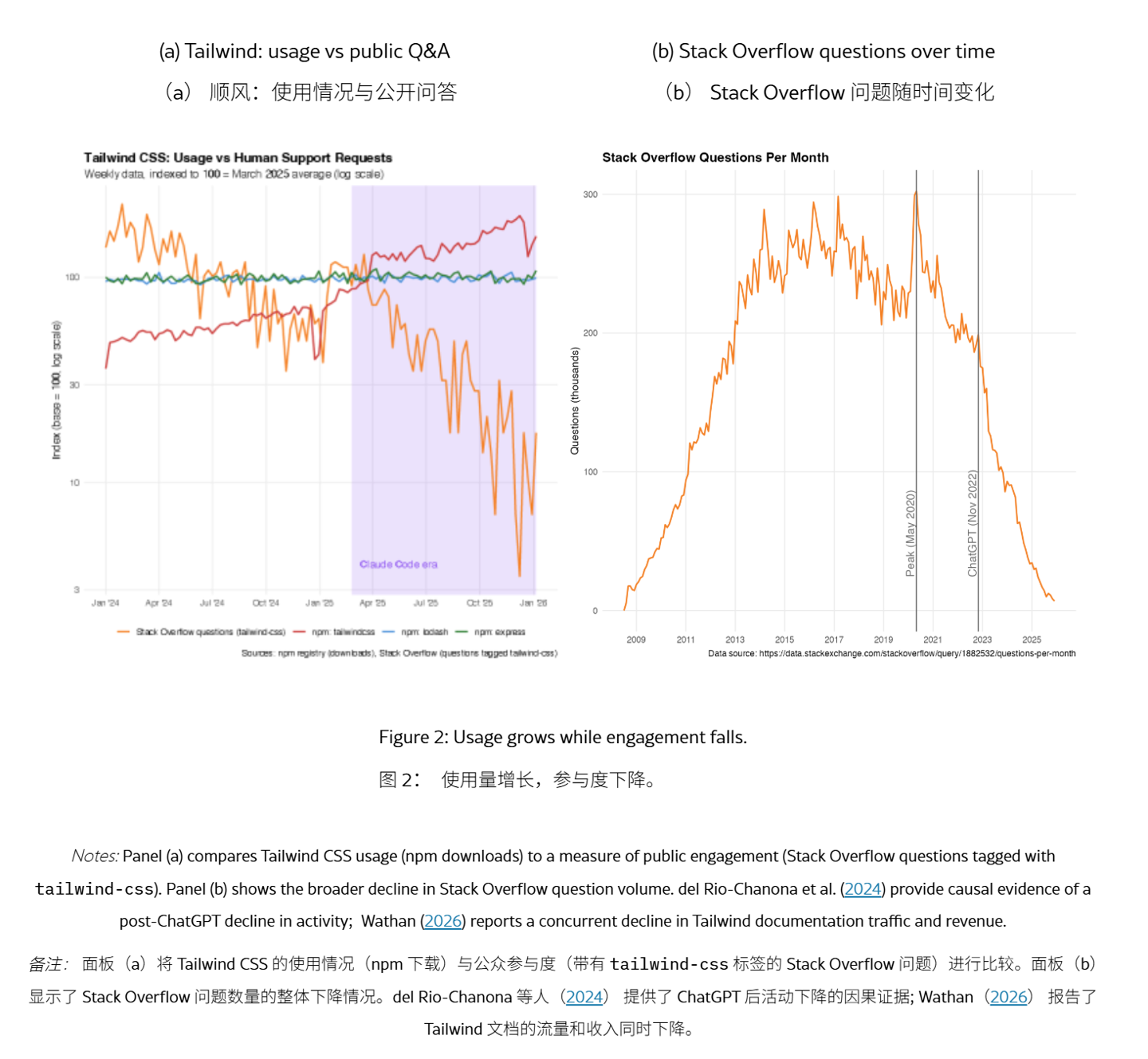 报告详细阐述了VibeCoding如何通过“去中介化”行为引发“需求转移”,使得开源软件使用量激增的同时,维护者依赖的流量和互动数据却大幅下降。以TailwindCSS为例,其npm下载量不断攀升,但文档访问流量自2023年初以来下降了40%,相关收入缩水近80%。此外,StackOverflow等技术问答平台的流量也出现了大幅下滑,表明AI工具正在“偷走”本应属于开源维护者的注意力红利。