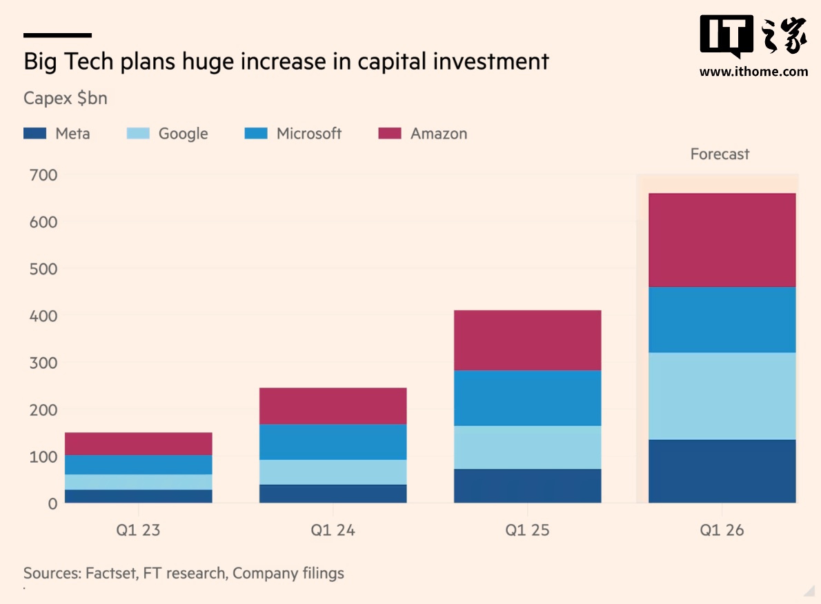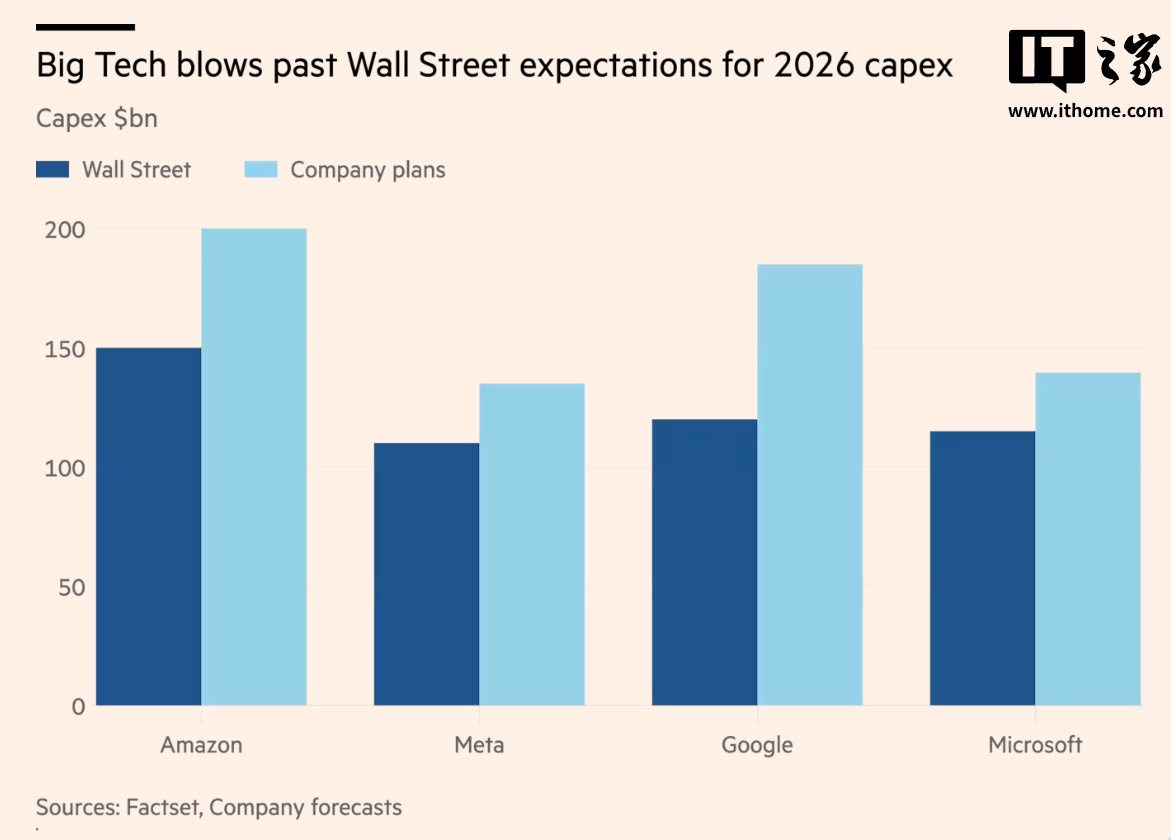 谷歌、微软和Meta为争夺AI霸权,宣布2026年资本支出将达到6600亿美元,较2025年激增60%,是2024年支出的两倍多。亚马逊宣布今年资本支出将达到2000亿美元,超出市场预期500亿美元,导致其股价在盘前交易中下跌8%。微软季度数据中心支出激增66%,且首次披露对OpenAI的风险敞口:在微软6250亿美元的未来云合同中,有45%来自OpenAI,引发分析师对其过度依赖单一客户的担忧。