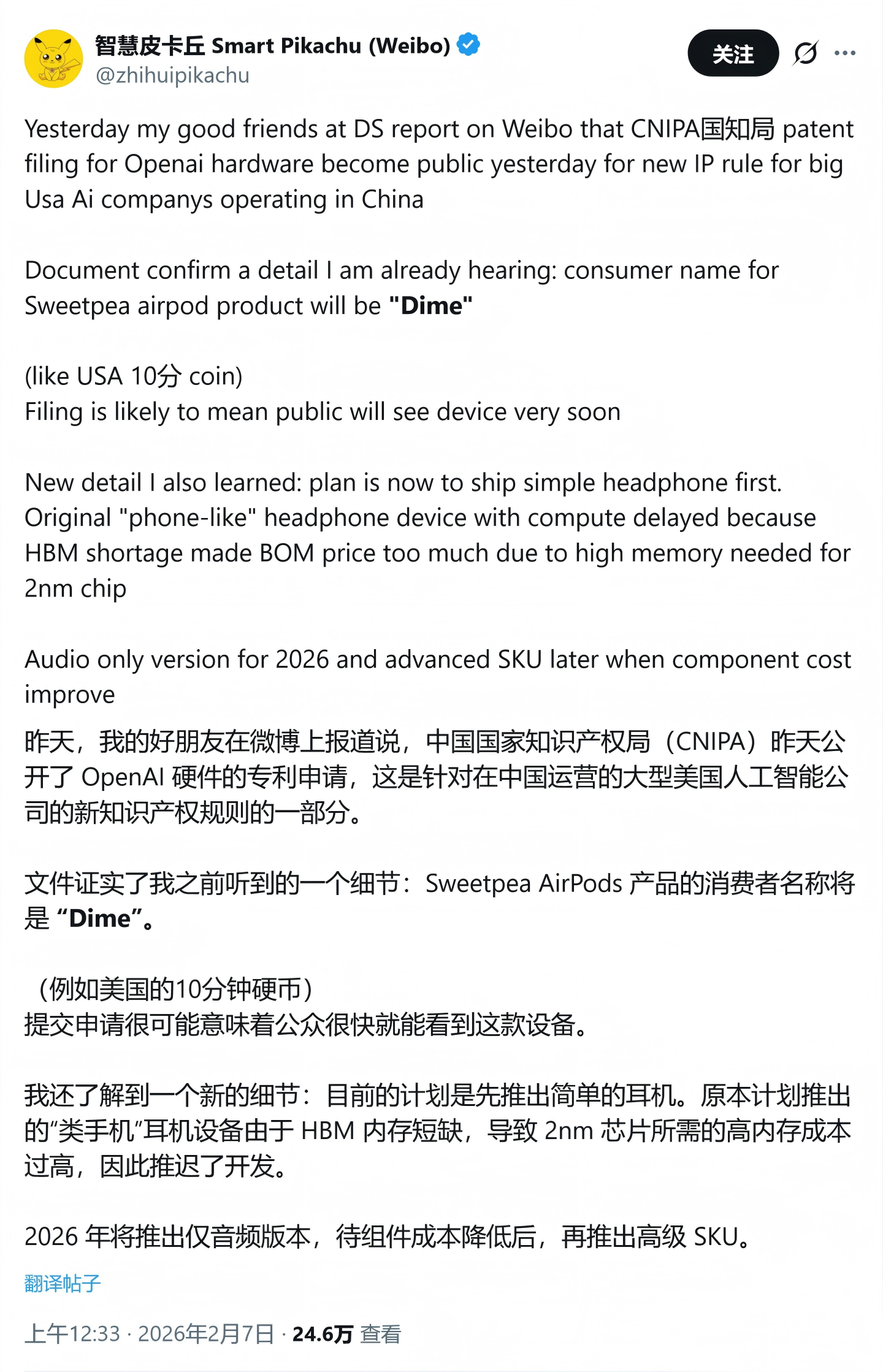 2月7日消息,消息源@智慧皮卡丘在X平台发布推文,透露OpenAI的首款硬件产品名为Dime(音译:十美分),是一款类似苹果AirPods的耳机产品。根据推文内容,OpenAI原本计划打造一款具有独立算力、物料成本媲美智能手机的“类手机”架构革命性设备,但由于存储芯片供应短缺导致组件价格飙升,公司决定搁置激进方案,转而优先开发功能相对单一、更接近传统形态的AI音频耳机。