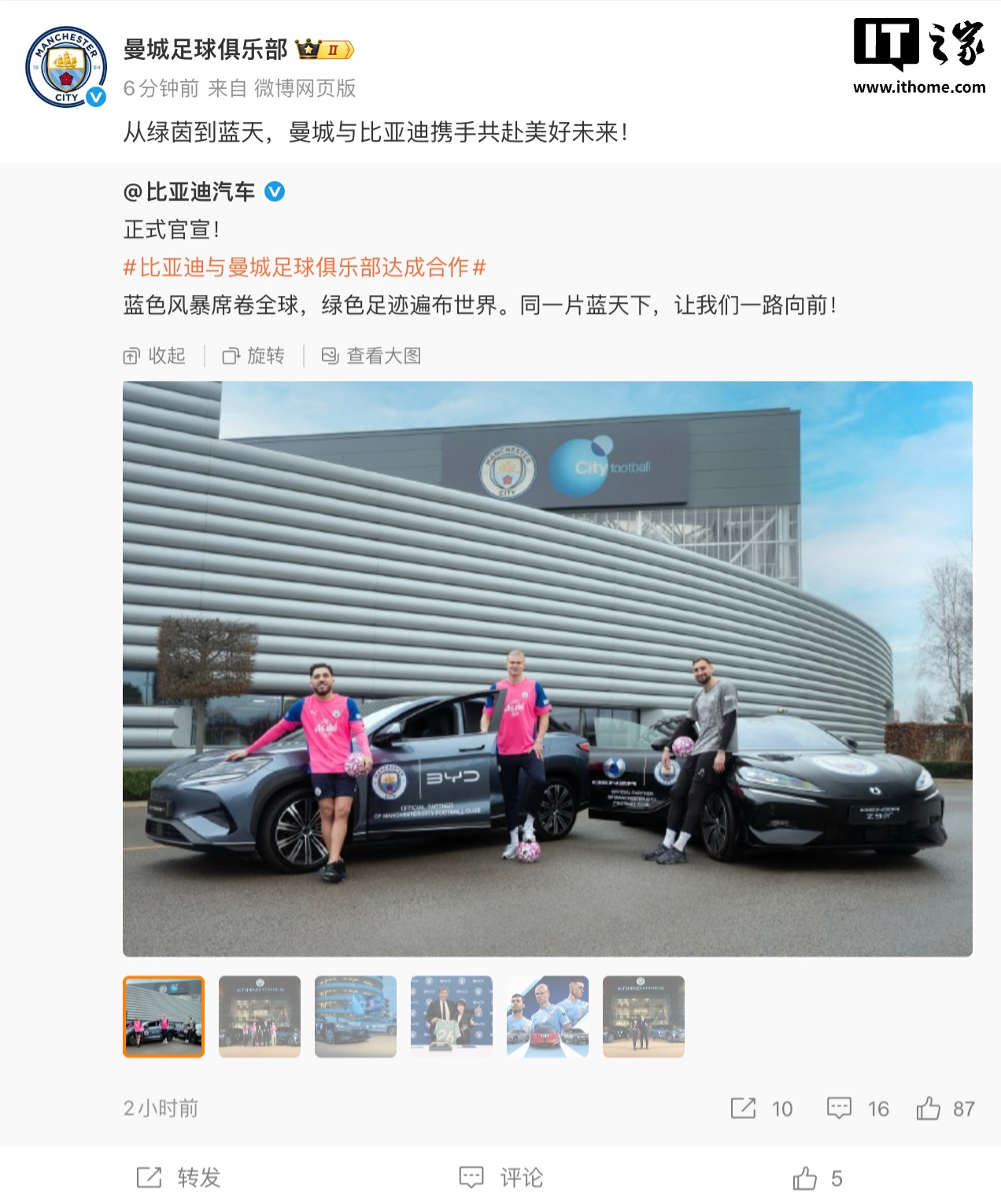 今日,比亚迪与曼城足球俱乐部宣布达成深度战略合作,比亚迪正式成为曼城足球俱乐部的官方合作伙伴。此次合作标志着比亚迪将为俱乐部提供包括比亚迪及腾势品牌车辆在内的新能源技术支持,助力俱乐部实现绿色运营。比亚迪还将为曼彻斯特城市足球学院提供配套的车辆充电和储能
