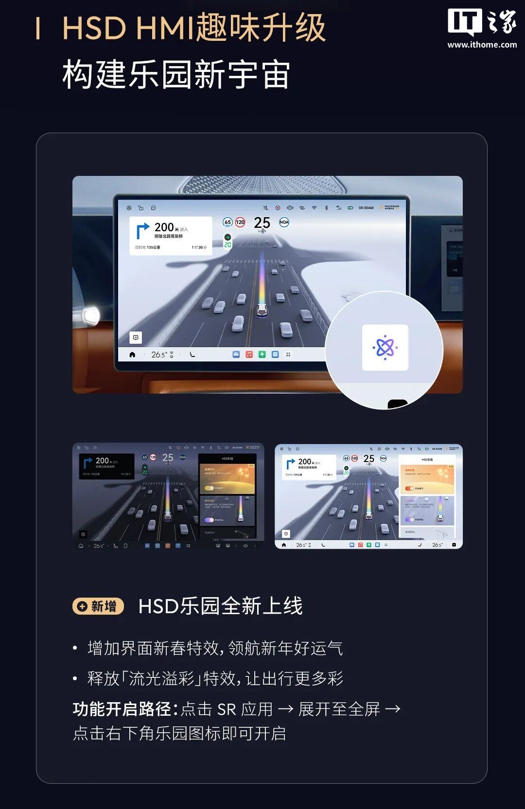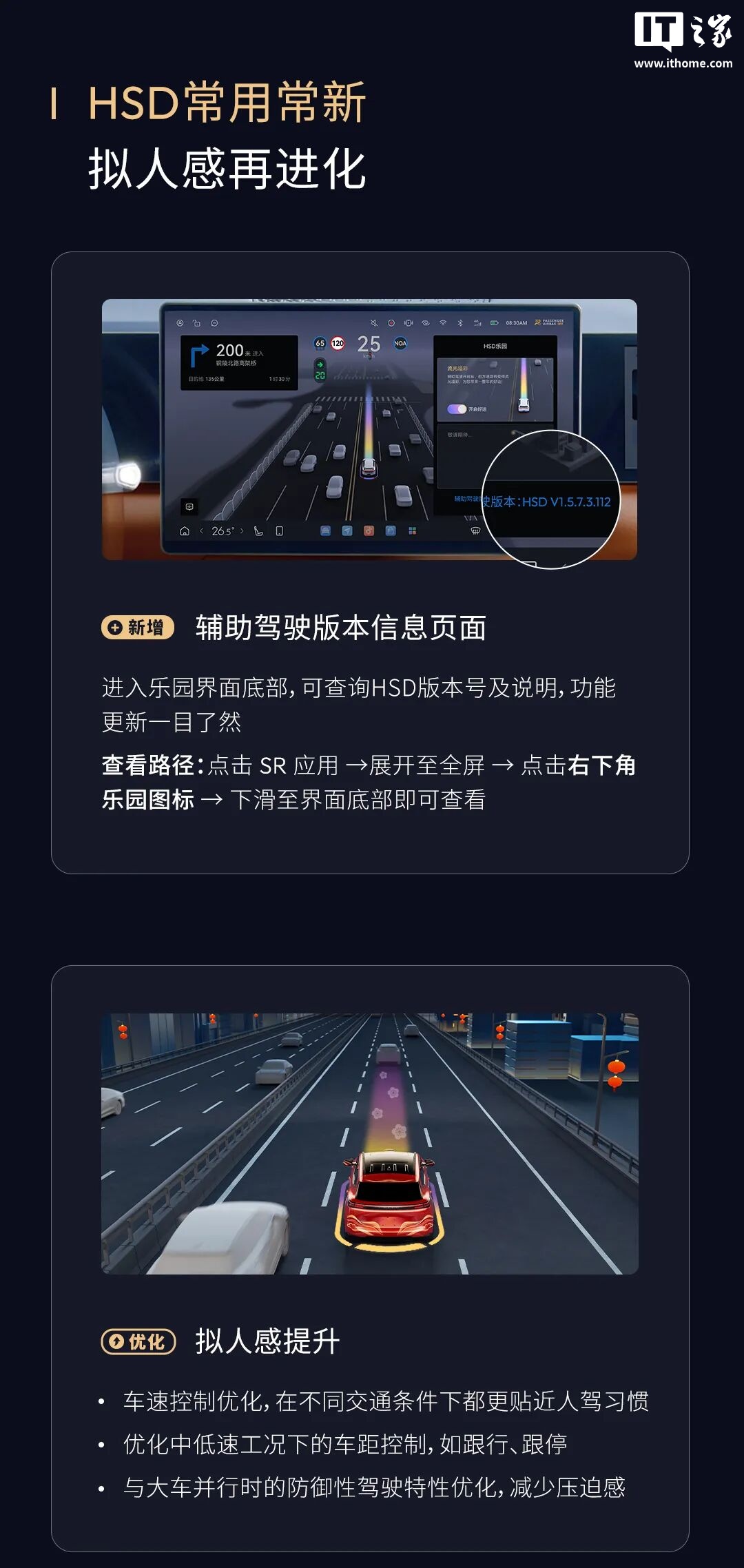 更新内容包括HSD乐园的全新上线,增加了新春特效和“流光溢彩”特效,以及辅助驾驶版本信息页面的新增,方便用户查询HSD版本号及更新说明。在驾驶体验方面,更新优化了车速控制和车距控制,特别是在中低速工况下,以及与大车并行时的防御性驾驶特性,减少压迫感。此外,路口通行体验得到提升,优化了路口进入速度控制和红绿灯遮挡时的防御性驾驶,同时强化了对交通标识的理解能力。