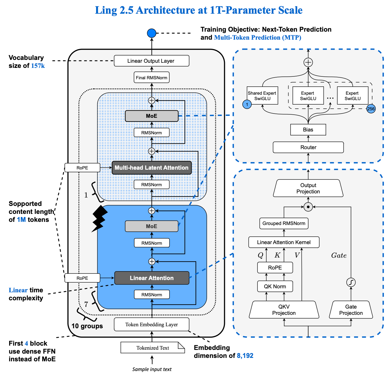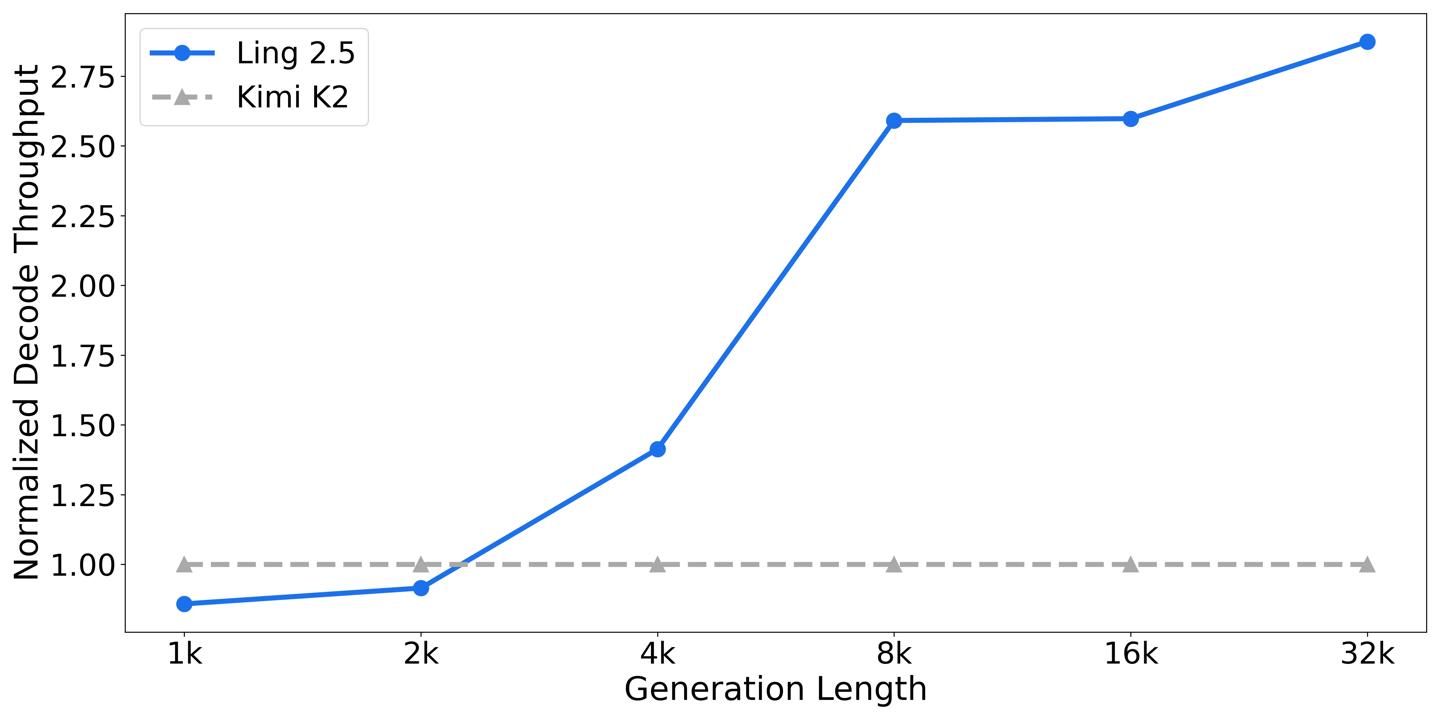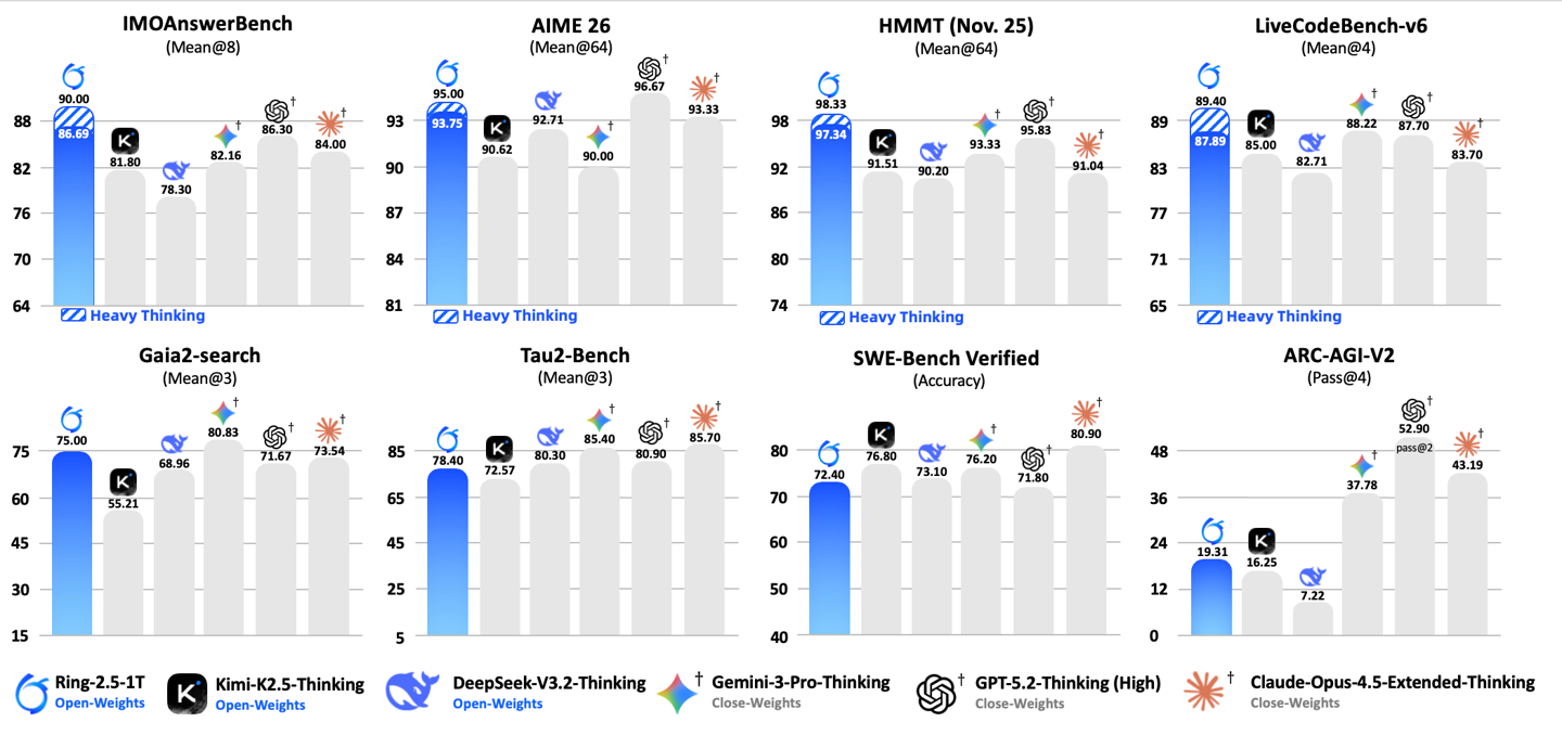 Ring-2.5-1T在数学、代码、逻辑等高难推理任务和智能体搜索、软件工程、工具调用等长程任务执行上达到了开源领先水平。团队还测试了深度思考模式,通过扩展并行思考与总结,有效提升推理的深度与广度。在IMO2025和CMO2025中,Ring-2.5-1T均达到金牌水平。此外,Ling2.5架构在Ling2.0架构基础上引入了混合线性注意力架构,通过增量训练方式,将GQA升级为1:7的MLA+LightningLinear结构,显著提升了长程推理场景下的吞吐能力。