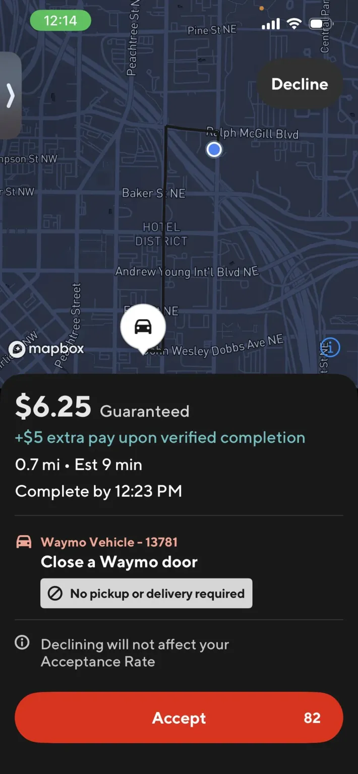 对Waymo而言,支付几美元请人关门是合理成本,因为车辆一旦无法行驶,就无法继续接单,甚至可能影响道路通行。类似情况此前已在洛杉矶出现。Waymo与拖车服务应用Honk合作,当地用户曾获得最高24美元报酬关闭车门,金额远高于亚特兰大的
