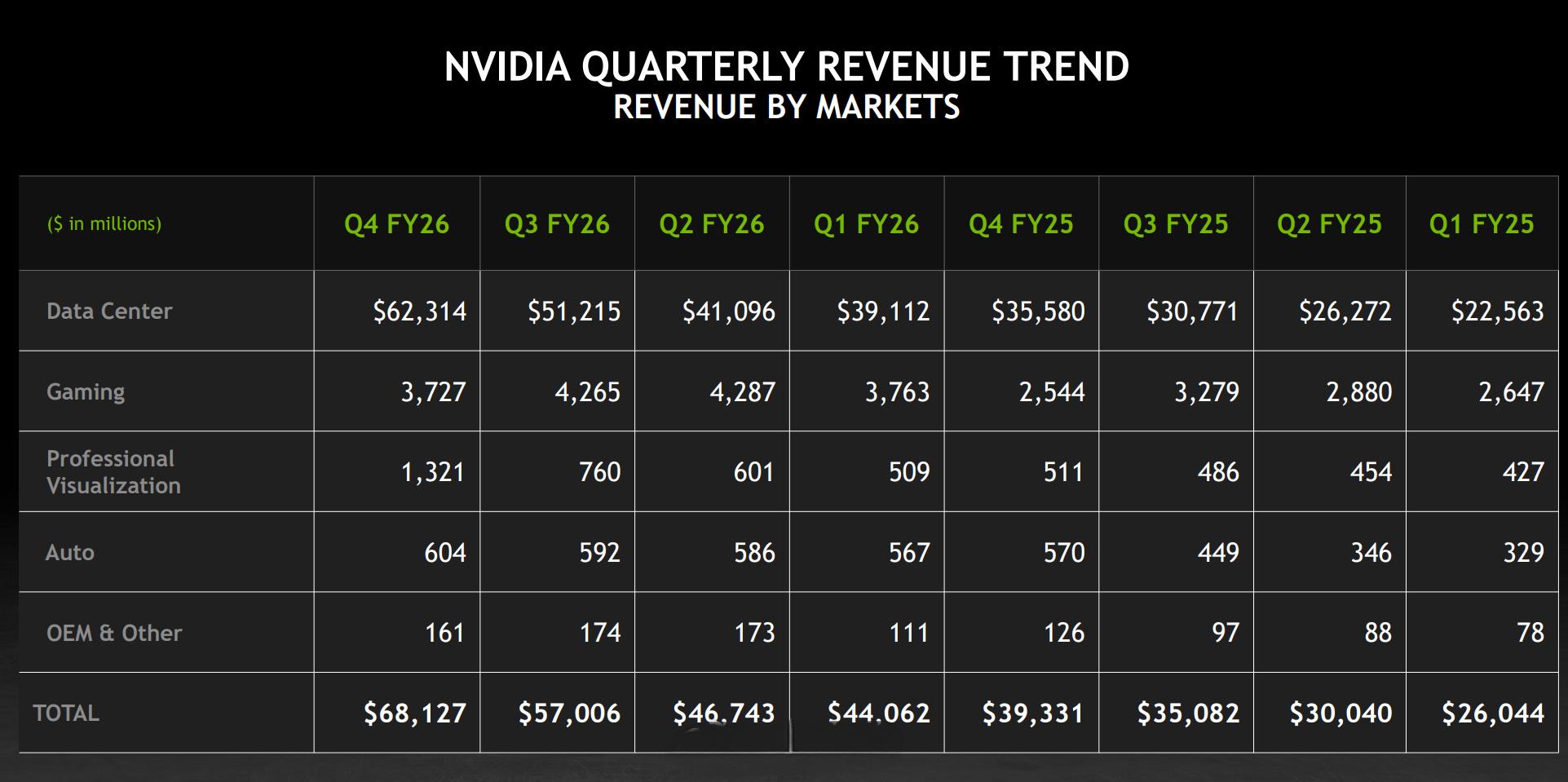 谷歌、亚马逊、Meta、微软四大云厂商持续加码 AI 基建,华尔街预计其 2026 年合计资本开支接近 7000 亿美元,英伟达仍是这轮投入的最大受益者。游戏、专业可视化、汽车业务分别营收37亿、13亿和6.04亿美元。