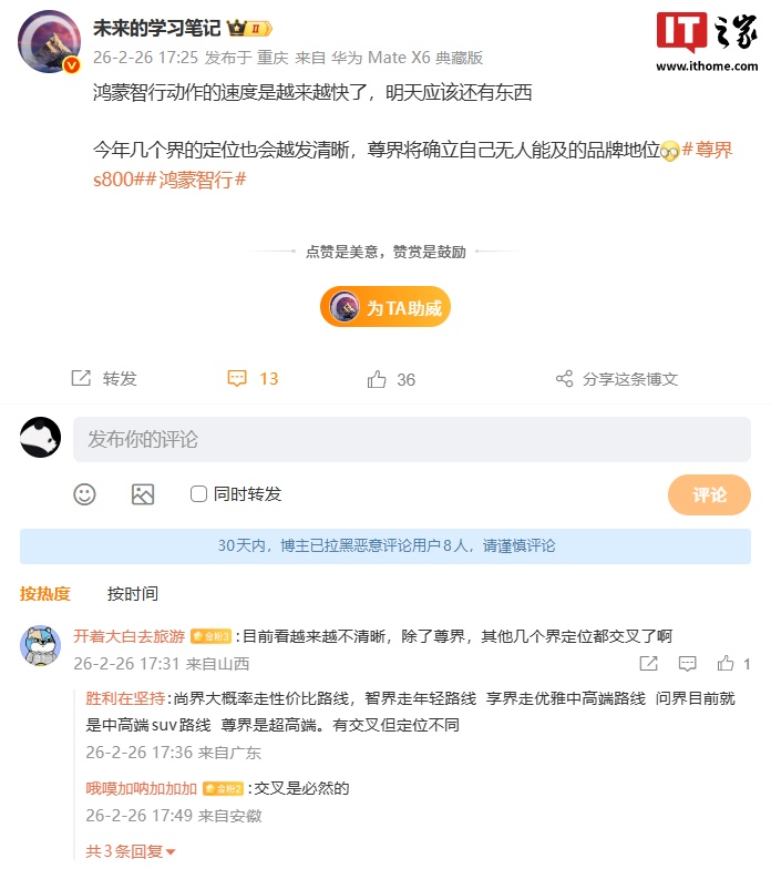 2月26日,博主@未来的学习笔记透露,鸿蒙智行技术的发展步伐正在加快,预计近期将有新的动态。博主强调,今年鸿蒙智行在五界的定位将更加明确,尊界品牌将确立其在行业中的领先地位。