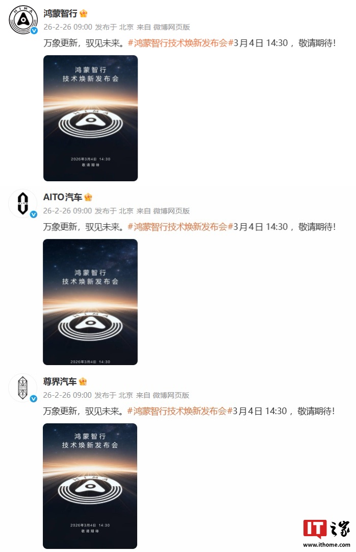 华为终端近日宣布,鸿蒙智行技术焕新发布会将于3月4日14:30举行,官方宣传语为“万象更新,驭见未来”。目前,鸿蒙智行、AITO汽车和尊界汽车已官宣参与此次发布会。根据此前智界V9的预热情况,此次发布会预计将重点围绕问界和尊界展开,展示鸿蒙智行技术的最新成果和应用。