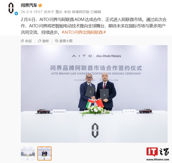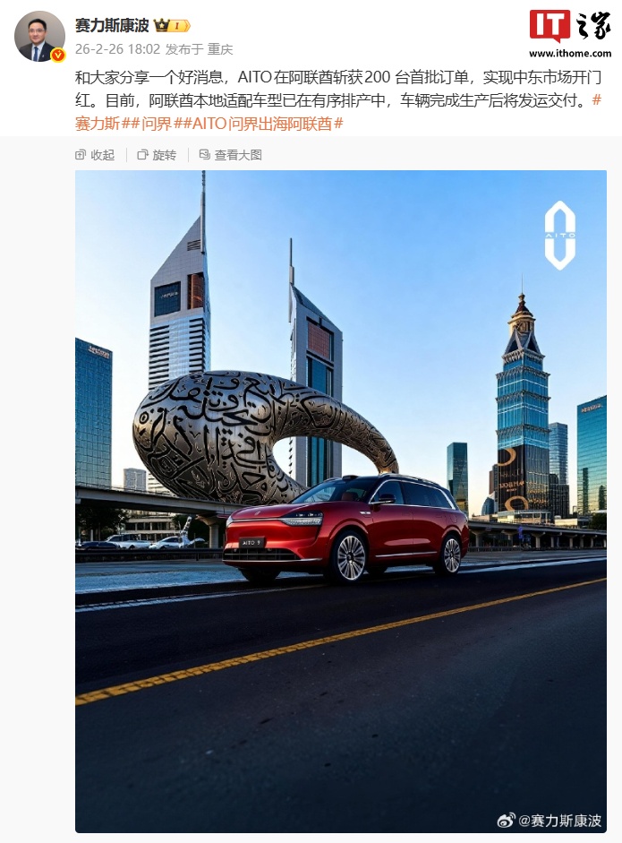 2月26日,赛力斯集团副总裁康波宣布,AITO问界汽车在阿联酋市场取得重大突破,成功获得200台首批订单,标志着品牌在中东市场的成功起步。康波透露,目前阿联酋本地适配车型的生产工作正在有序进行,预计车辆生产完成后将迅速发运并交付给客户。