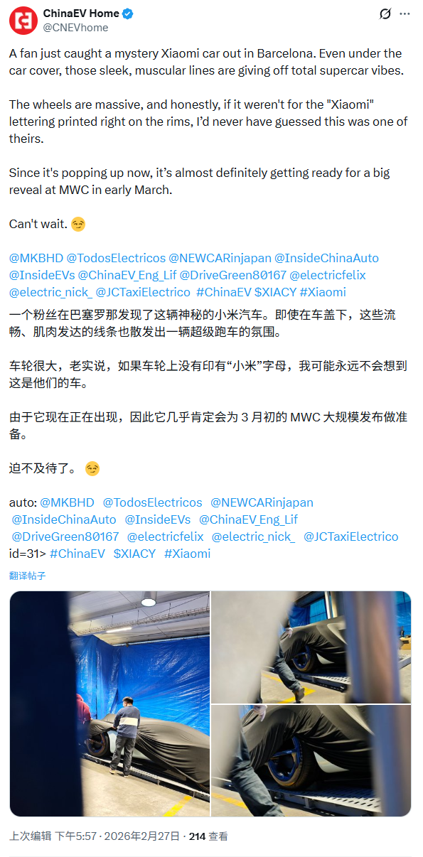 2月27日,西班牙巴塞罗那街头出现了一台疑似小米未发布的全新超跑车型,可能是一款概念车。该车型拥有流畅且充满肌肉感的线条,轮毂罩上印有“xiaomi”字样。这一发现引起了广泛关注,因为小米新车在这个时间点出现在巴塞罗那,被认为可能是为了即将开幕的MWC2026做准备,预示着小米可能在大会上展示其汽车领域的最新技术或产品。