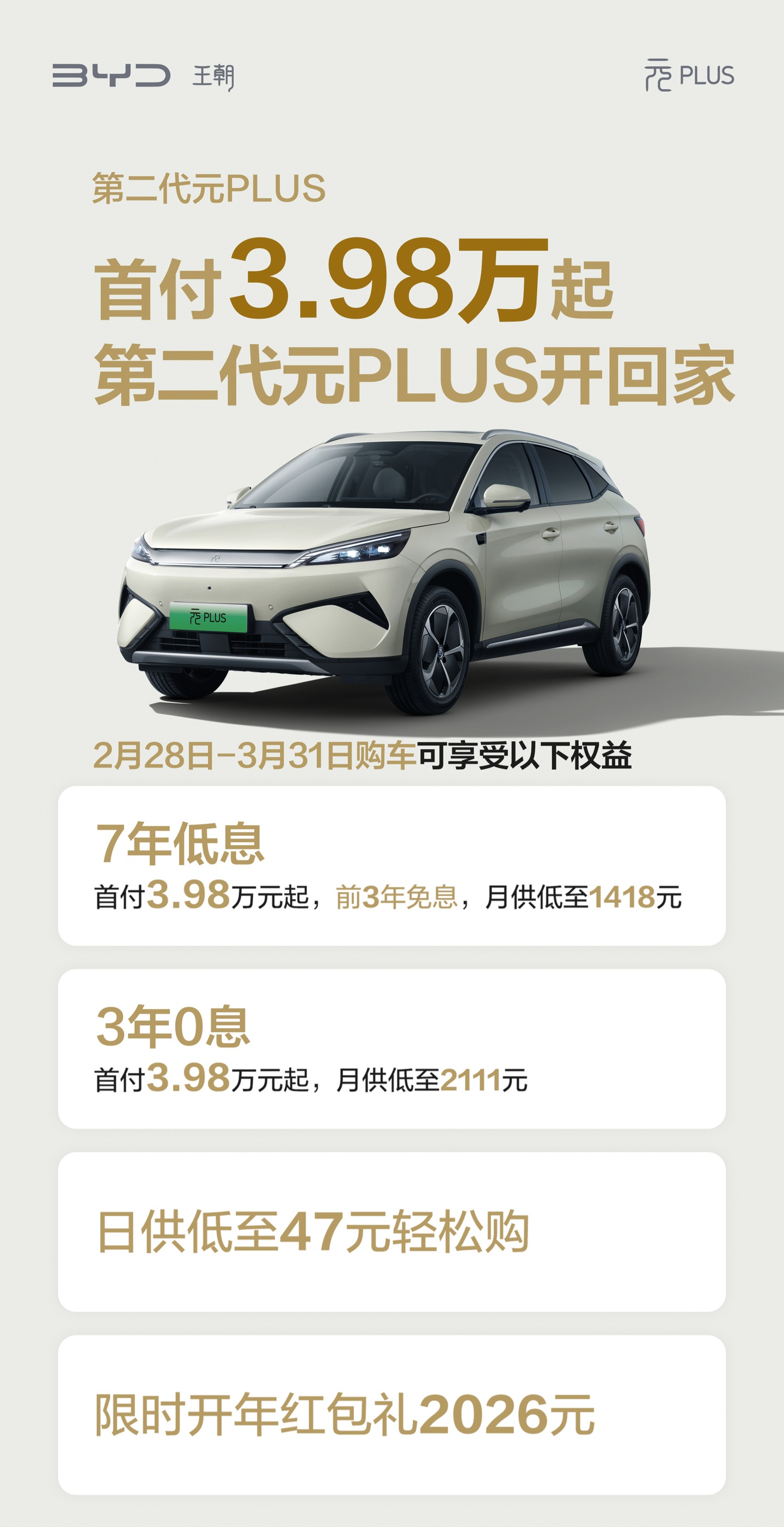 今日,比亚迪汽车宣布第二代元PLUS推出“最强金融政策”,首付3.98万元起。该车型提供7年低息和3年0息两种权益方案,前者月供低至1418元,后者月供低至2111元。第二代元PLUS于2025年3月上市,全系升级搭载智能座舱高阶版-DiLink100、天神之眼-C高阶智驾三目版,内置5G芯片,支持四音区语音识别、3D控车、标配车载ETC。价格方面,430km领先型11.58万元起,510km卓越型14.58万元。
