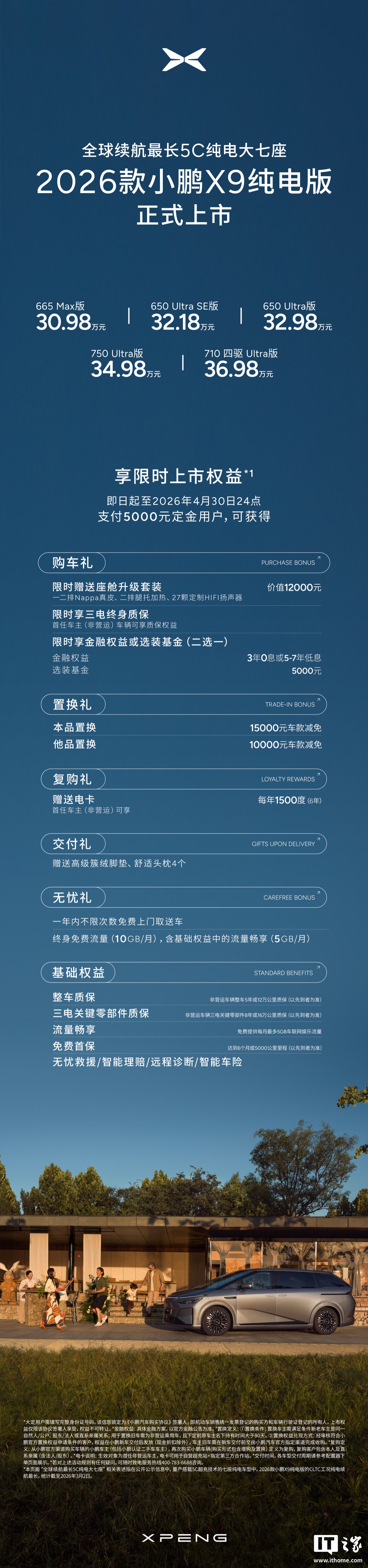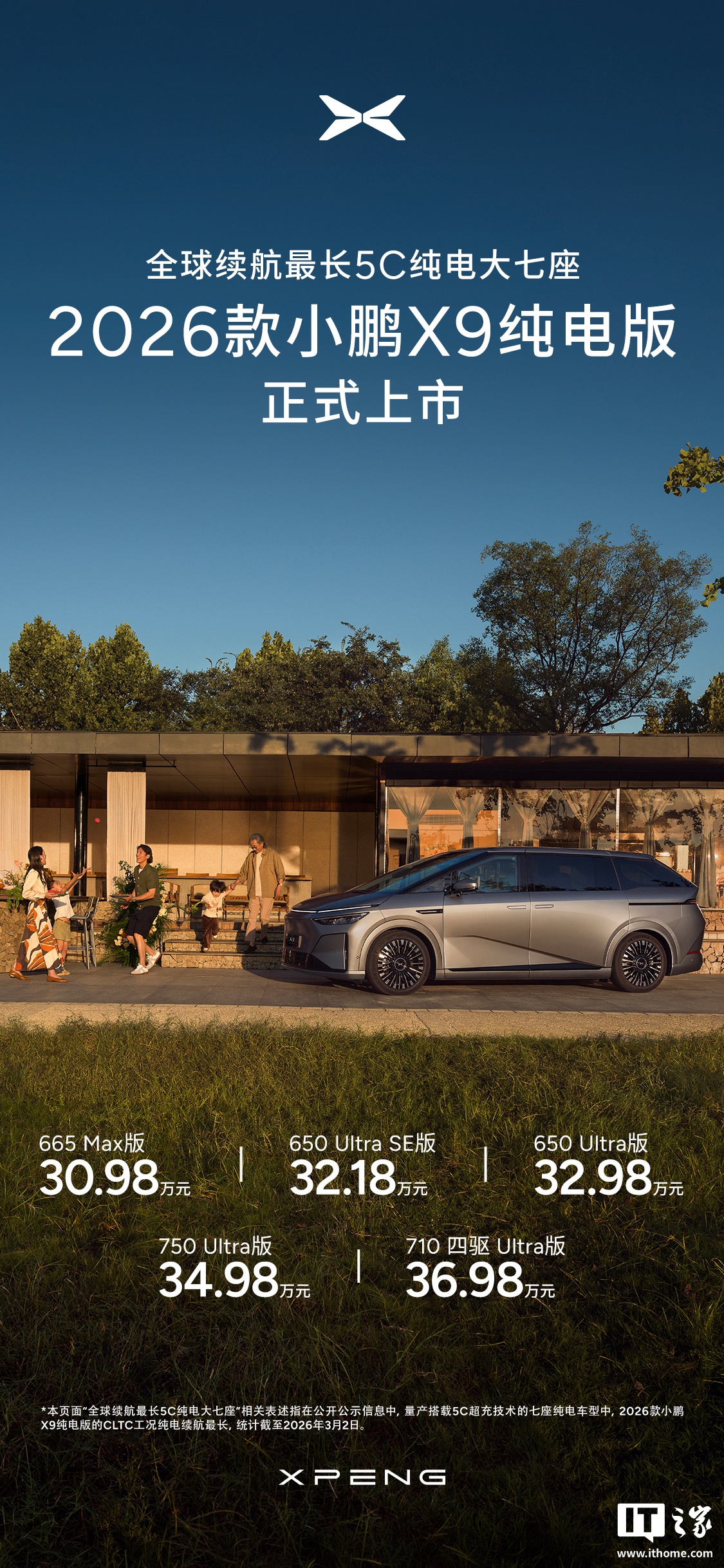 今日,2026款小鹏X9纯电版MPV车型正式上市,起售价为30.98万元。这款新车以其“全球续航最长5C纯电大七座”的定位,全系标配5C超充技术,CLTC续航能力可达750km,综合电耗百公里15.9kWh。小鹏X9在座椅配置上提供了三排电动“三折叠”座椅,支持4/5/6/7座的灵活布局,同时标配安全气囊的零重力座椅,可实现180°躺平,并拥有180mm的同级最宽中央过道。
