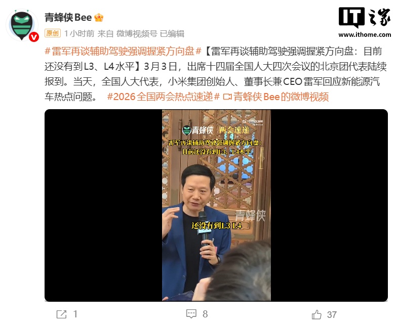 3月3日,全国人大代表、小米集团创始人兼董事长兼CEO雷军在十四届全国人大四次会议期间,就新能源汽车热点问题发表看法。雷军特别强调了汽车辅助驾驶的重要性,他指出,尽管智能电动车技术正在快速发展,但当前的辅助驾驶系统尚未达到L3或L4级别,因此驾驶员在使用这些系统时仍需保持高度警惕。