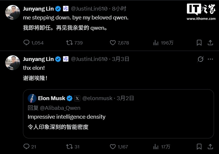 3月4日,阿里巴巴千问核心负责人林俊旸在社交平台宣布卸任。此前,阿里千问于3月2日开源了4款Qwen3.5小尺寸模型系列,包括Qwen3.5-0.8B/2B/4B/9B,这一动作在海外社交媒体上获得了