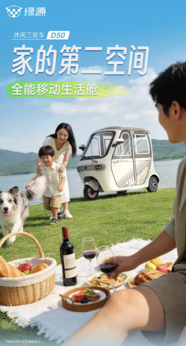 3月6日,绿源品牌推出了全新的D50休闲三轮车,这款产品以其“全能移动生活舱”的定位吸引了市场关注。该三轮车设计有两种风格:精致通勤风和萌系卡通风,主要区别在于顶棚和侧边拉花的设计。车身尺寸为2280*1140*1680mm,配备四开门和大车窗,提供全视角高清前挡风玻璃,并标配电动雨刮。