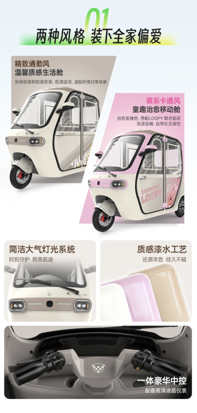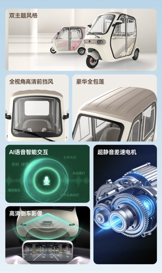 轮胎,有效防止扎胎。此外,该三轮车还支持AI语音智能交互,能够执行如打开大灯等操作,并配备陡坡缓降、空挡驻车、动力模式调节等辅助功能。解锁方式多样,支持蓝牙/App/钥匙共享/机械钥匙解锁,并配备高清倒车影像。车辆提供燕麦白、烟青灰、露比粉、塔塔绿等多种配色选择。