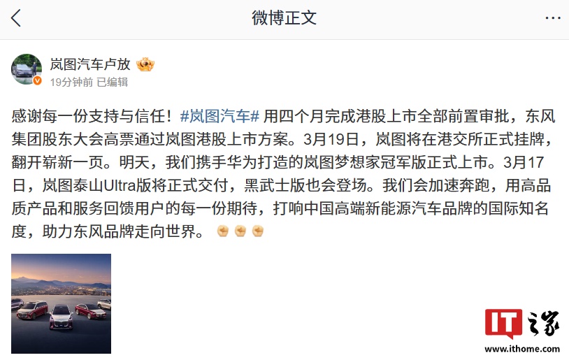 今日,岚图汽车科技股份有限公司董事长卢放宣布,公司已用四个月时间完成港股上市的全部前置审批,东风集团股东大会也高票通过了岚图港股上市方案。根据计划,岚图汽车将于3月19日正式在港交所挂牌。此外,岚图汽车与华为合作的岚图梦想家冠军版将于明天正式上市,而岚图泰山Ultra版则将在3月17日交付,同时黑武士版也将亮相。