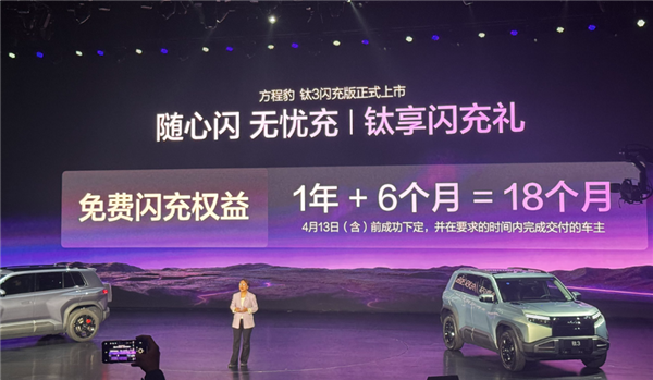 3月13日,方程豹钛3闪充版正式上市,售价区间为15.38万元至16.98万元。新车提供620km后驱闪充版和565km四驱闪充版两种配置。为庆祝上市,方程豹为4月13日(含)前下定并在规定时间内完成交付的车主提供额外6个月免费闪充权益。钛3闪充版搭载比亚迪第二代刀片
