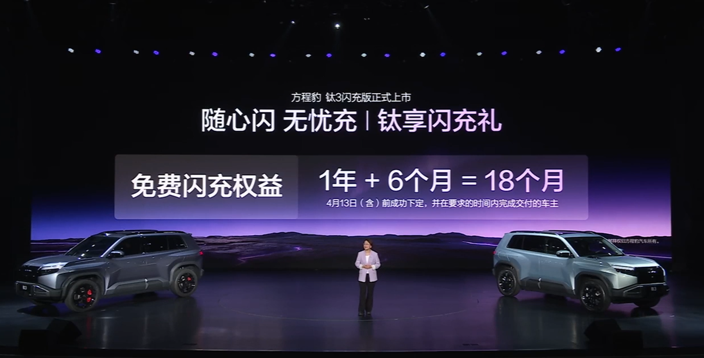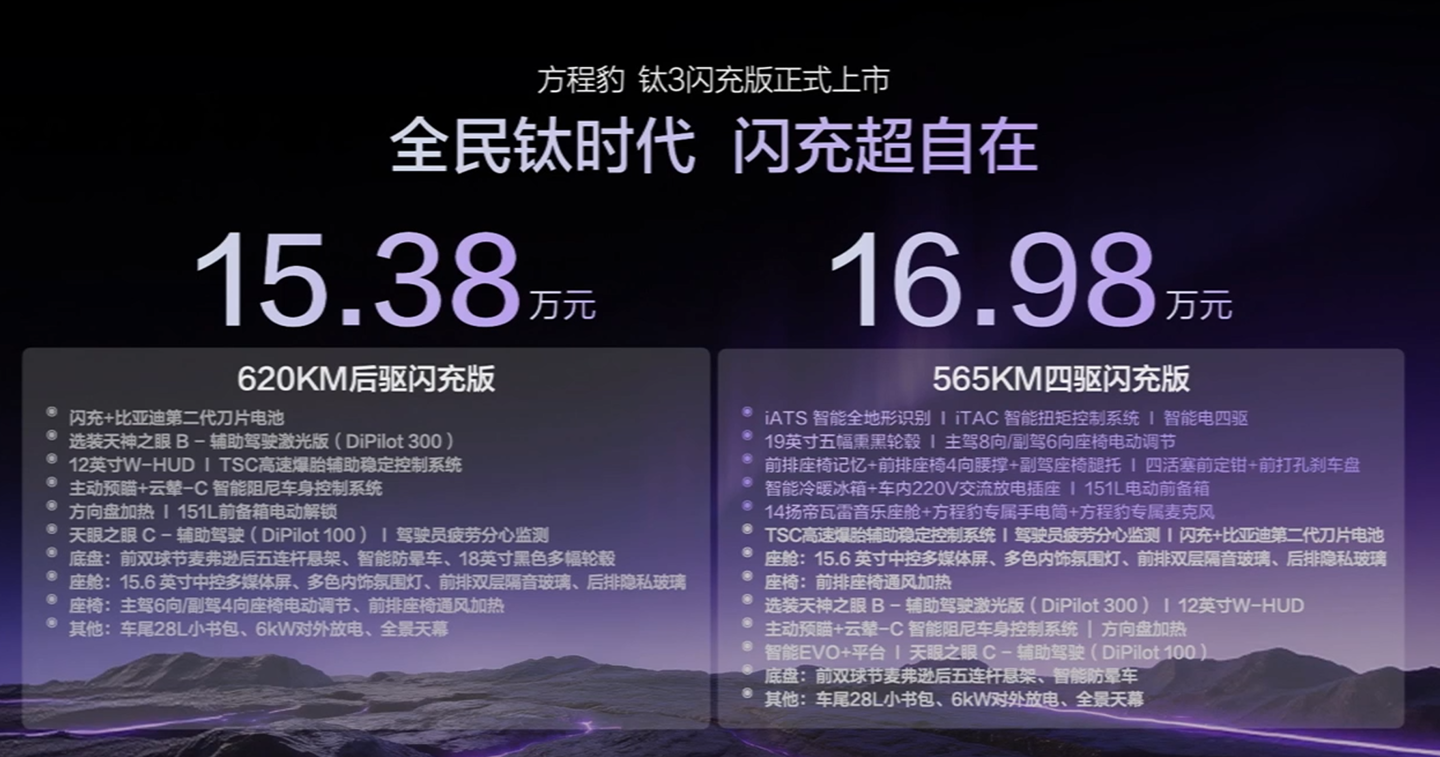 3月13日,比亚迪方程豹钛3闪充版正式上市,提供620KM后驱闪充版和565KM四驱闪充版两种配置,起售价为15.38万元。新车全系标配比亚迪闪充技术、智能EVO+平台、云辇-C+主动预瞄、AI智能座舱等多项先进配置,旨在提升车主的补能体验。