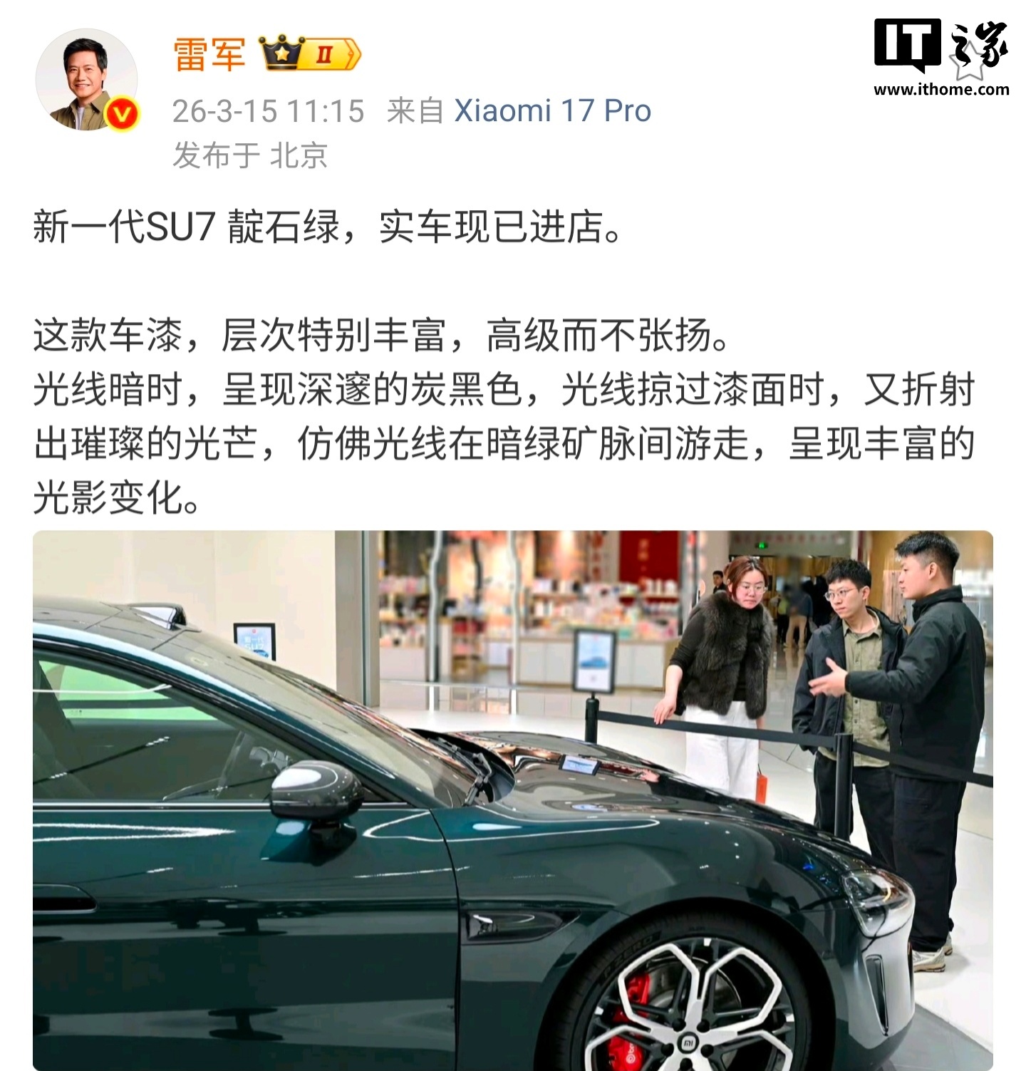 3月15日,小米汽车宣布新一代SU7“靛石绿”实车已进店,本月将正式亮相。新一代SU7共推出9款车色,包括卡布里蓝、赤霞红等。雷军表示,新车漆层次丰富,高级而不张扬,光线变化下呈现深邃炭黑与璀璨光芒。新一代小米SU7预售价22.99万-30.99万元,全系标配激光雷达、700TOPS辅助驾驶算力等,在智能辅助驾驶方面明显升级。安全配置上,全系标配2200MPa强度钢制防滚架、四门防撞梁及9安全气囊。底盘配备1500MPa防护横梁与高强防护涂层,耐刮擦、耐撕裂性能提升10倍,耐穿刺性能提升13倍。车门采用三重机械冗余开启设计。