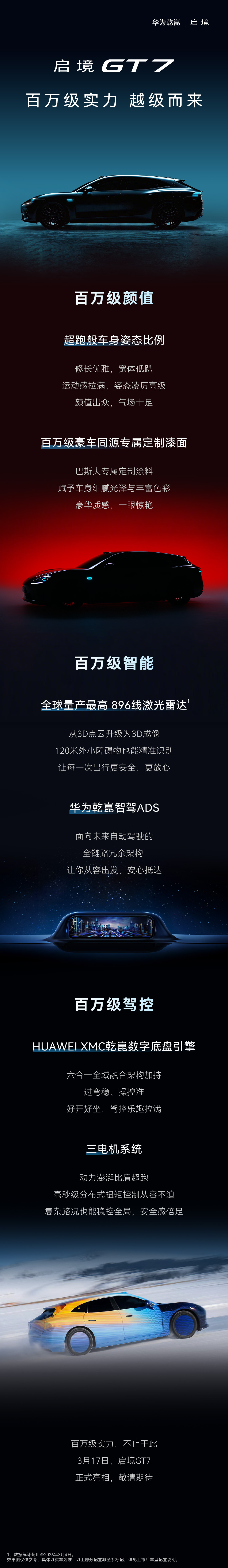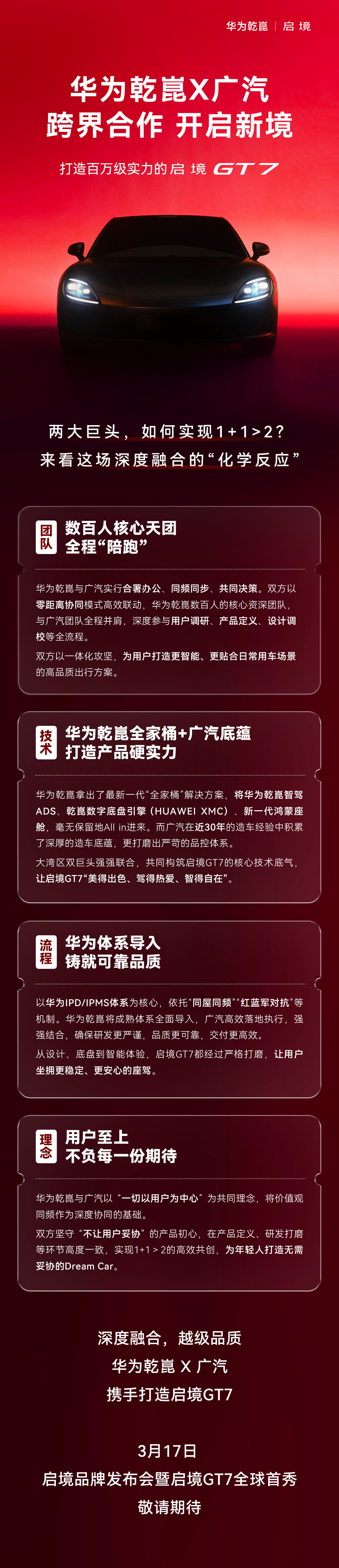 今日,启境汽车官微宣布,与华为乾崑、广汽深度融合打造的启境GT7将于3月17日全球首秀。华为乾崑与广汽实行合署办公、同频同步、共同决策,华为乾崑数百人的核心资深团队与广汽团队全程并肩,深度参与用户调研、产品定义、设计调校等全流程。华为乾崑拿出了最新一代“全家桶”解决方案,包括华为乾崑智驾ADS、乾崑数字底盘引擎(HUAWEIXMC)、新一代鸿蒙座舱等,全面导入启境GT7。