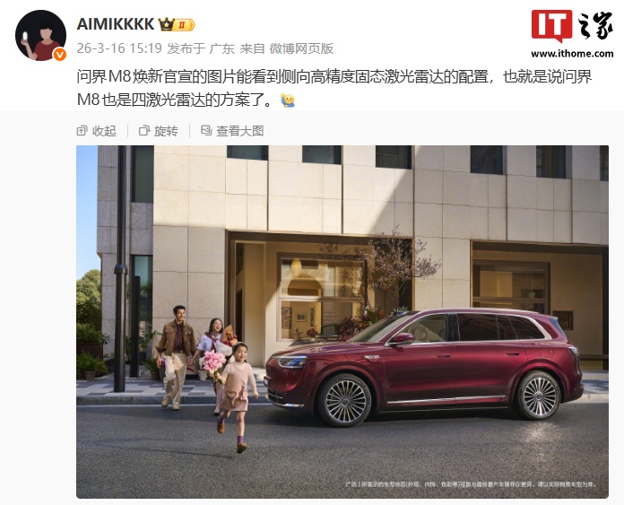 今日,鸿蒙智行宣布其“家庭智慧旗舰SUV”问界M8将迎来焕新升级,并推出全新车色瑞红、湛蓝。新车预热图中显示,问界M8将配备侧向高精度固态激光雷达,使其成为四激光雷达方案的一部分。博主@爱叨叨的Steven透露,除了侧向激光雷达外,问界M8还将搭载华为乾崑全球量产最高896线激光雷达,这将显著提升其辅助驾驶能力。