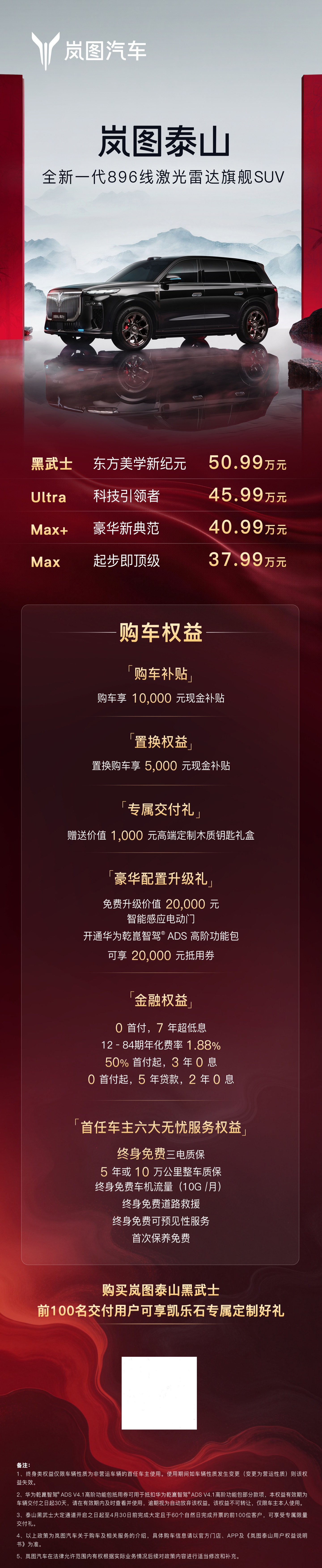 3月17日,中国首款量产L3级SUV——岚图泰山黑武士正式上市,限量发售价格为50.99万元。新车采用全黑化外观设计,配备6个辅助驾驶小蓝灯,整车尺寸为5230×2025×1817mm,轴距3120mm,内部采用2+2+2式6座布局。岚图泰山黑武士搭载了华为最顶级的乾崑智驾ADS四激光方案和全新一代896线双光路图像级激光雷达,具备L3级别辅助驾驶的硬件基础。车内配备华为16.1英寸中控屏、10.25英寸全液晶仪表和55英寸AR-HUD抬头显示,以及32个扬声器的VOYAHSound全景声音响系统。