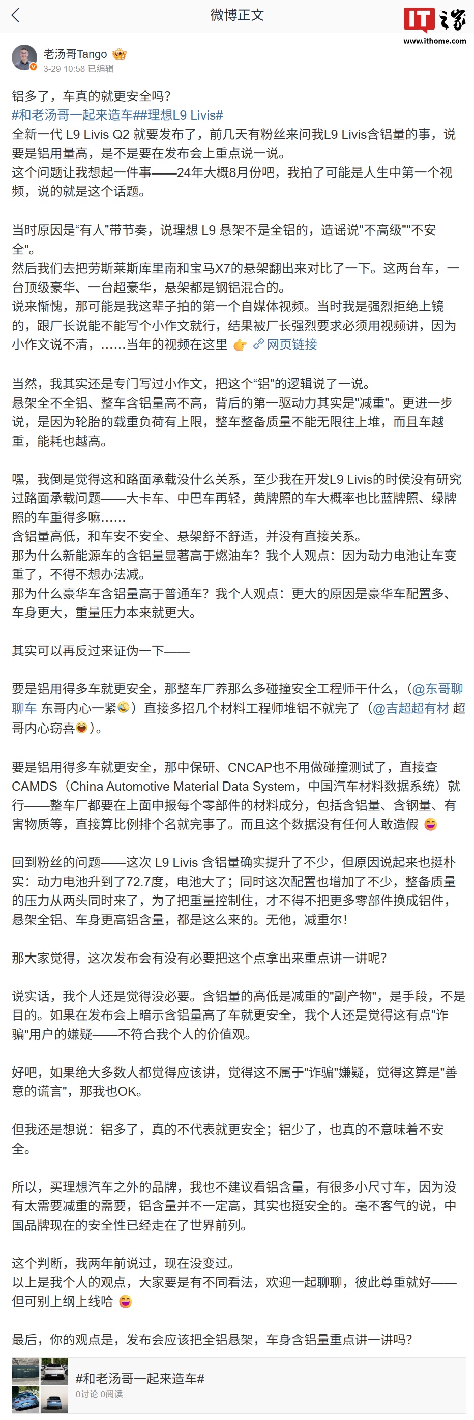 电池增加了车重,需要减重;豪华车含铝量高则是因为配置多、车身大,重量压力更大。他透露,理想L9的含铝量提升,是因为动力电池容量增加到72.7度,同时配置增加,为了控制整备质量,不得不使用更多铝件。汤靖认为,不应仅以铝含量判断车辆安全性,中国品牌的安全性已走在世界前列。