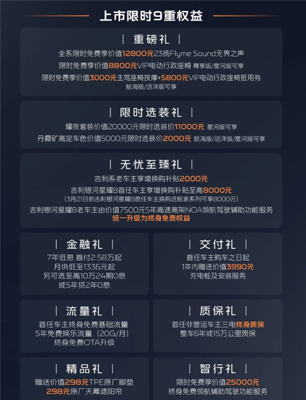 今日,吉利银河星耀8远航家正式上市,推出航海版、远洋版、星河版三款车型,官方指导价14.28-16.18万元,限时先享价12.98-14.88万元。新车在续航、智能驾驶、座舱体验三大核心维度全面进阶。外观设计延续溜背轿跑风格,车长5018mm、轴距2928mm,定位B+级轿车。新增日照金、丹霞矿两款配色,提供6种车漆选择。车内搭载15.4英寸中控屏,内置FlymeAuto2代系统,标配全景天幕、前排座椅通风/加热/按摩等。