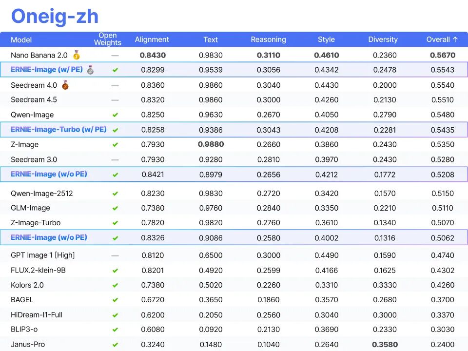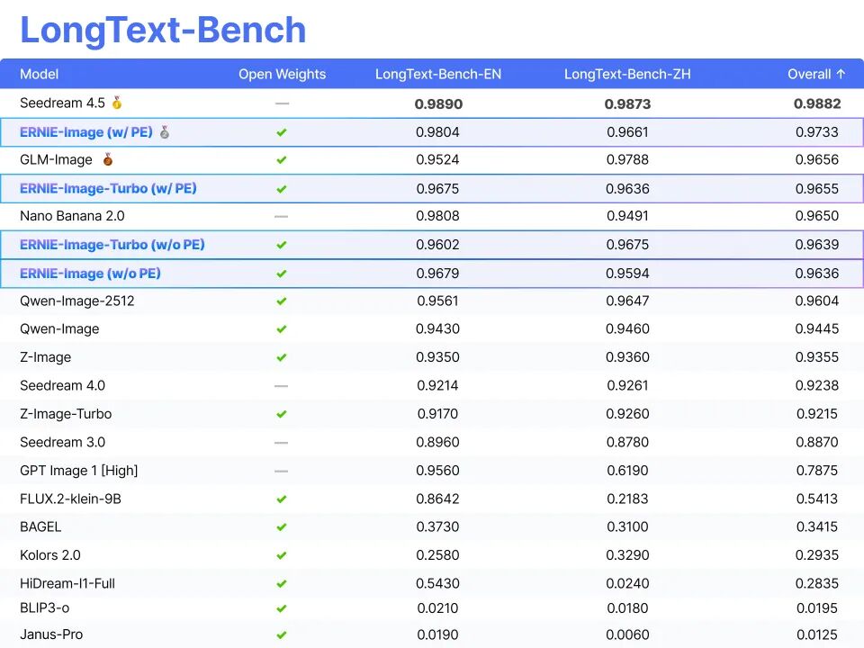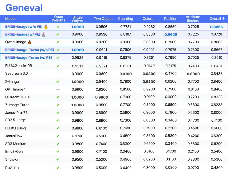 ERNIE-Image的模型权重和推理代码已在HuggingFace开源,遵循Apache2.0协议,并已支持ComfyUIWorkflow。此外,百度联合Unsloth推出GGUF量化方案,进一步优化模型性能。在多个国际基准测试中,ERNIE-Image展现了其在通用图像生成、双语理解、复杂指令执行等任务中的领先能力,尤其在文字渲染能力上达到开源模型的SOTA效果。