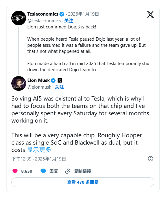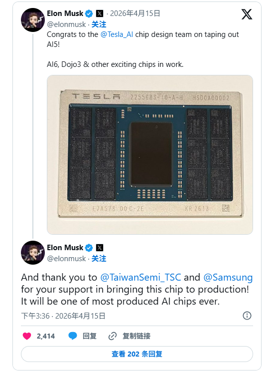 据悉,AI5芯片将由台积电和三星共同代工,大规模量产计划定在2026年底至2027年初。马斯克还透露,未来新一代芯片的生产将落地特斯拉TeraFab工厂,目前该工厂的正式公告尚未发布。特斯拉下一代A16芯片、Dojo3超级计算机的研发工作已经启动,未来TeraFab工厂投用后,特斯拉将实现DRAM研发、芯片封装与芯片制造的全流程一体化布局。