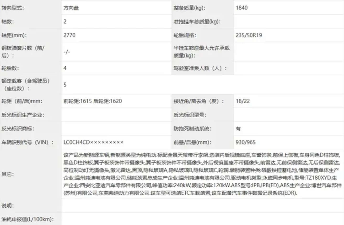 4月15日,比亚迪全新元PLUS车型出现在工信部最新一期减免车辆购置税的新能源汽车车型目录中。该车型将搭载57.545kWh和68.547kWh两种容量的