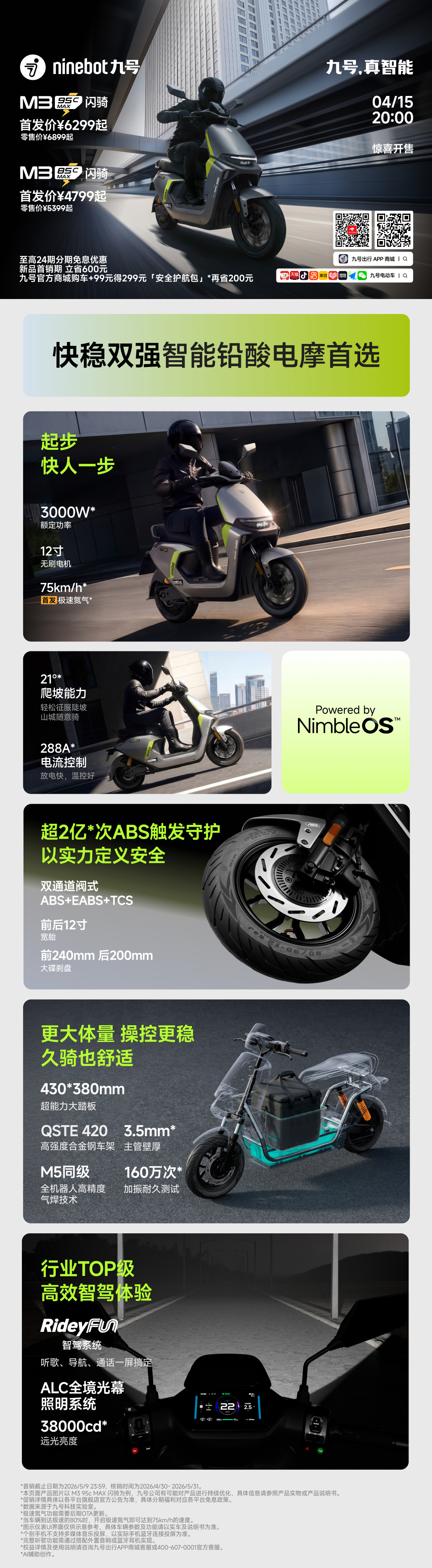 4月15日,九号电动宣布推出两款智能铅酸电摩新品,分别为九号M395cMAX闪骑和九号M385cMAX闪骑。九号M395cMAX闪骑新品首发价6299元起,而九号M385cMAX闪骑新品首发价4799元起。这两款新车均搭载12英寸无刷电机,额定功率3000W,峰值功率4100W,电流控制288A,支持75km/h氮气模式和21°爬坡能力。此外,车辆还具备行业Top级智驾功能和IPX5级防水性能。