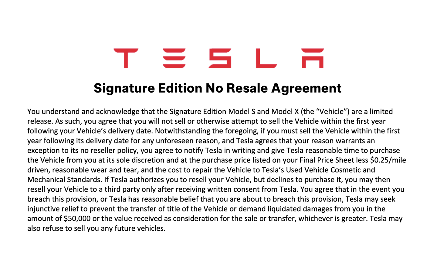 4月16日,特斯拉宣布Model S和Model X的生产将以350辆签名版车型收尾,这些车辆附带大量专属权益,定价高昂。购车者必须同意自交付日起至少一年内不得转售。外媒曝光的订单文件显示,购买最后一批Model S Plaid与Model X Plaid签名纪念版的用户,在提车前必须签署一份禁止转售协议。车主需承诺在车辆交付后的第一年内,不得出售、甚至不得尝试出售该车。一旦违约,车主将需支付5万美元违约金,或赔偿其转售获利金额,以两者中数额更高者为准。