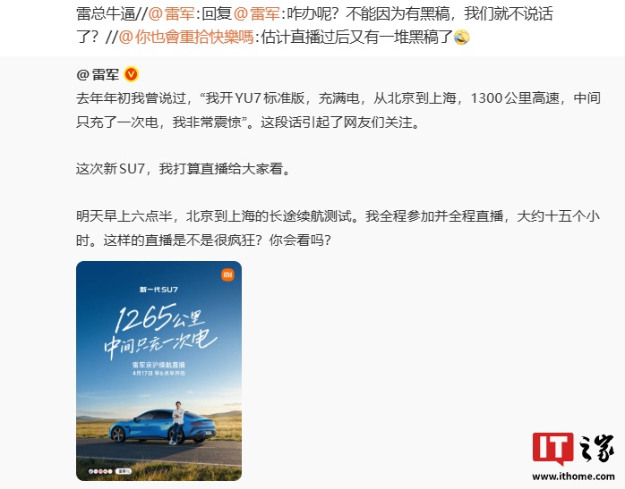 4月16日,小米公司董事长兼CEO雷军宣布,将于4月17日早上六点半开始直播新一代小米SU7的长途续航测试。此次测试将从北京出发至上海,全程约十五个小时,雷军本人将全程参与并直播。针对网友对直播可能引发负面评论的担忧,雷军回应表示,不能因为担心黑稿就选择沉默。