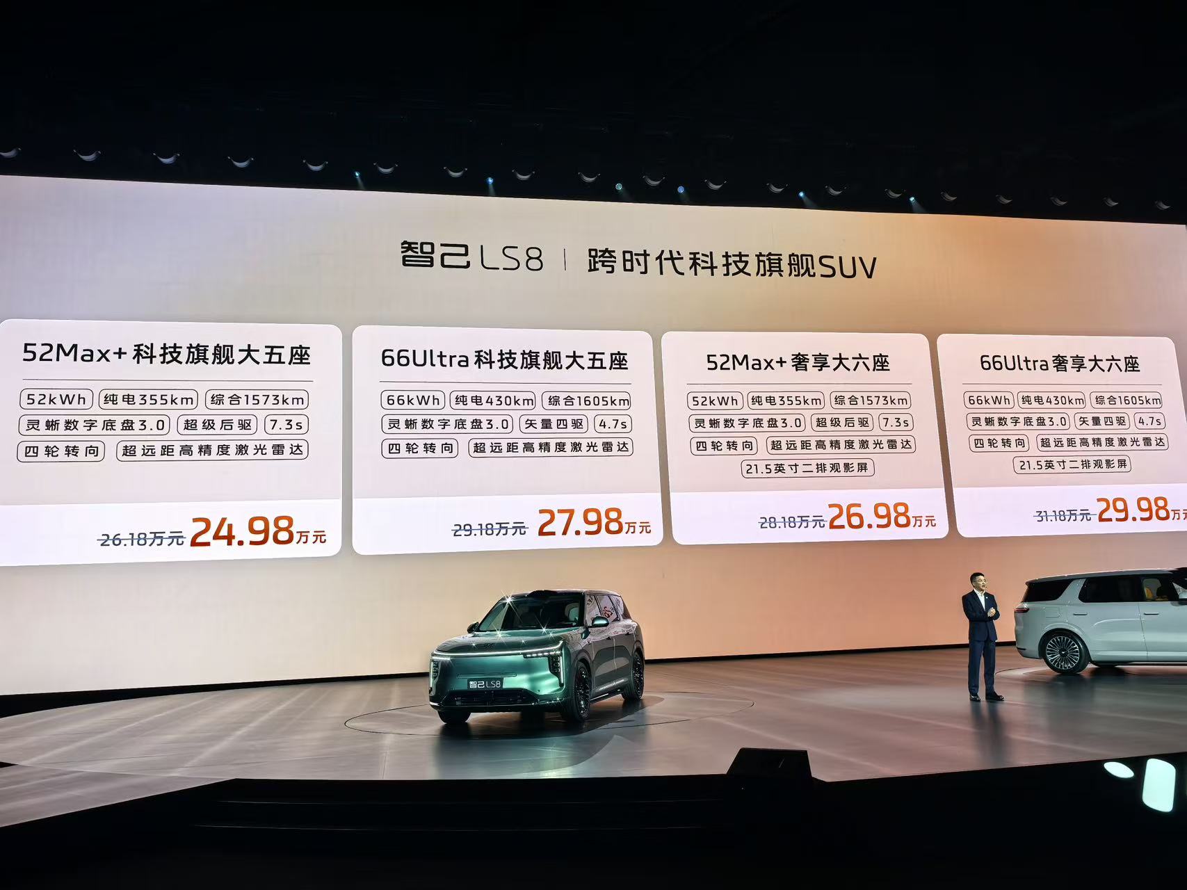 4月16日,智己汽车宣布旗下全新SUV车型LS8正式上市,共推出4款车型,官方指导价为26.18-31.18万元,上市权益价24.98-29.98万元。上市60分钟,大定破8000台。智己LS8延续了LS9的设计风格,前脸采用霸气的贯穿式一体灯组设计,车身侧面线条流畅,提供5种颜色选择。车身尺寸为5085/2000mm/1817(1807)mm,轴距3060mm,定位中大型SUV,提供5座和6座两种座椅布局。