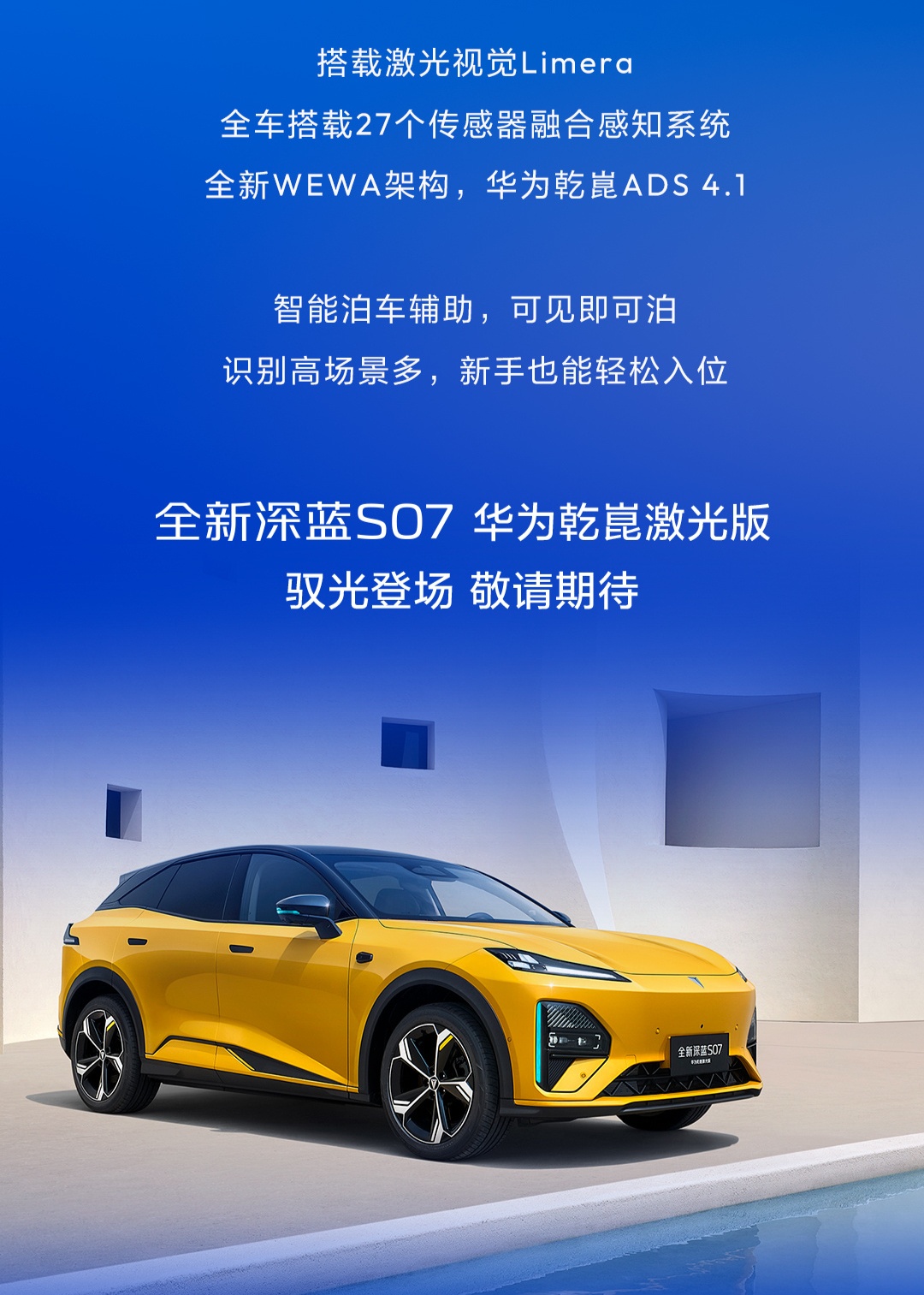 4月16日,长安深蓝汽车宣布其全新深蓝S07华为乾崑激光版汽车已首发亮相,并公布了外观。这款新车配备了27个传感器融合感知系统,支持华为乾崑ADS4.1辅助驾驶系统。深蓝S07华为乾崑激光版在泊车辅助驾驶场景上提供了遥控泊车辅助RPA、离车泊入辅助EPA、自定义泊车辅助、循迹倒车辅助(RA)以及哨兵模式等功能。此外,新车还支持城区NCA领航辅助和高速NCA领航辅助,能够应对多种复杂路况,减少驾驶者的操作负担。