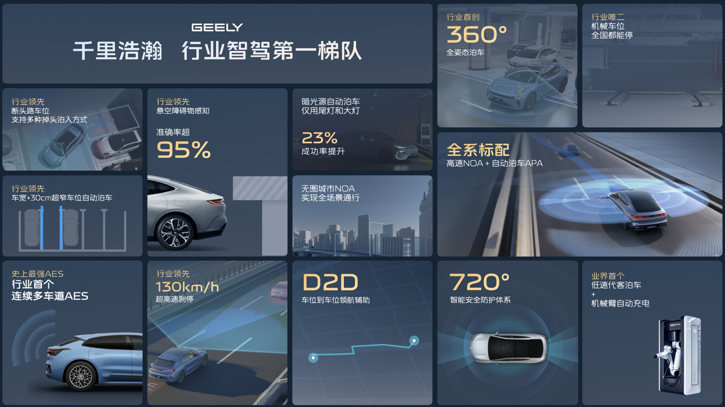 千里浩瀚安全高阶智能辅助驾驶系统于2025年3月发布,吉利银河全新及改款产品都将搭载不同层级的辅助驾驶方案。该系统支持360°全姿态泊车、无图城市NOA实现全场景通行、全系标配高速NOA+自动泊车APA等多项先进功能。今年2月,吉利汽车集团CEO淦家阅宣布,千里浩瀚将在今年实现出海,并将成为首个在海外市场实现规模化应用的中国高阶辅助驾驶方案。