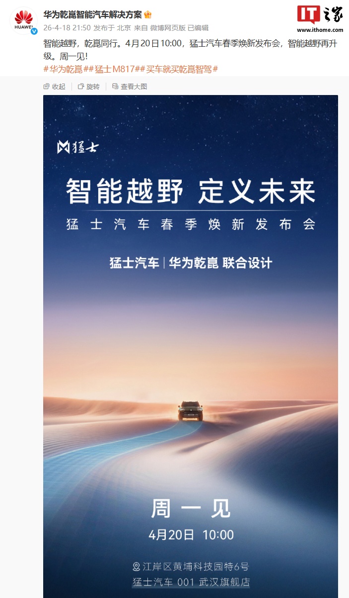 4月19日,华为乾崑智能汽车解决方案宣布,猛士汽车春季焕新发布会将于4月20日10:00举行,主题为“智能越野再升级”。此次发布会预示着猛士汽车与华为乾崑在渠道上的进一步合作,猛士汽车门店已开始挂上“华为乾崑”的字样。猛士M817作为全球首款全栈搭载华为乾崑智能的越野车,自去年9月发布以来,以其鸿蒙座舱HarmonySpace5和华为乾崑ADS4辅助驾驶系统受到市场关注,指导价区间为31.99万-36.99万元。