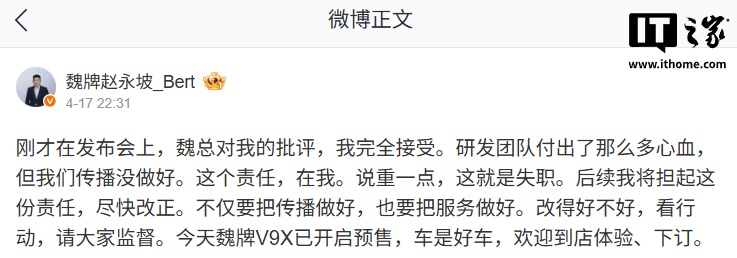 魏牌CEO赵永坡在发布会上回应魏建军的批评,表示完全接受,并承认传播工作未做好是自己的失职。他承诺将担起责任,尽快改正,不仅要改善传播,还要提升服务质量,请大家监督。目前,长城旗下归元S平台首款车型魏牌V9X已开启预售,定位为“AI豪华六座旗舰”,搭载混动技术架构“超级Hi4”,预售价37.18万元起。