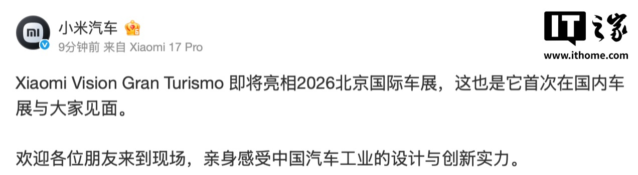 今日,小米汽车官方宣布,Xiaomi Vision Gran Turismo概念车即将在2026北京国际车展上首次亮相。这款双门超跑概念车由小米全球设计团队联手打造,以“由风塑形”为设计理念,追求风阻与下压力之间的完美平衡。小米首席设计师李田原强调,设计中不依赖额外加装部件,而是通过“少即是多”的原则,使每一处设计都具备空气动力学功能。