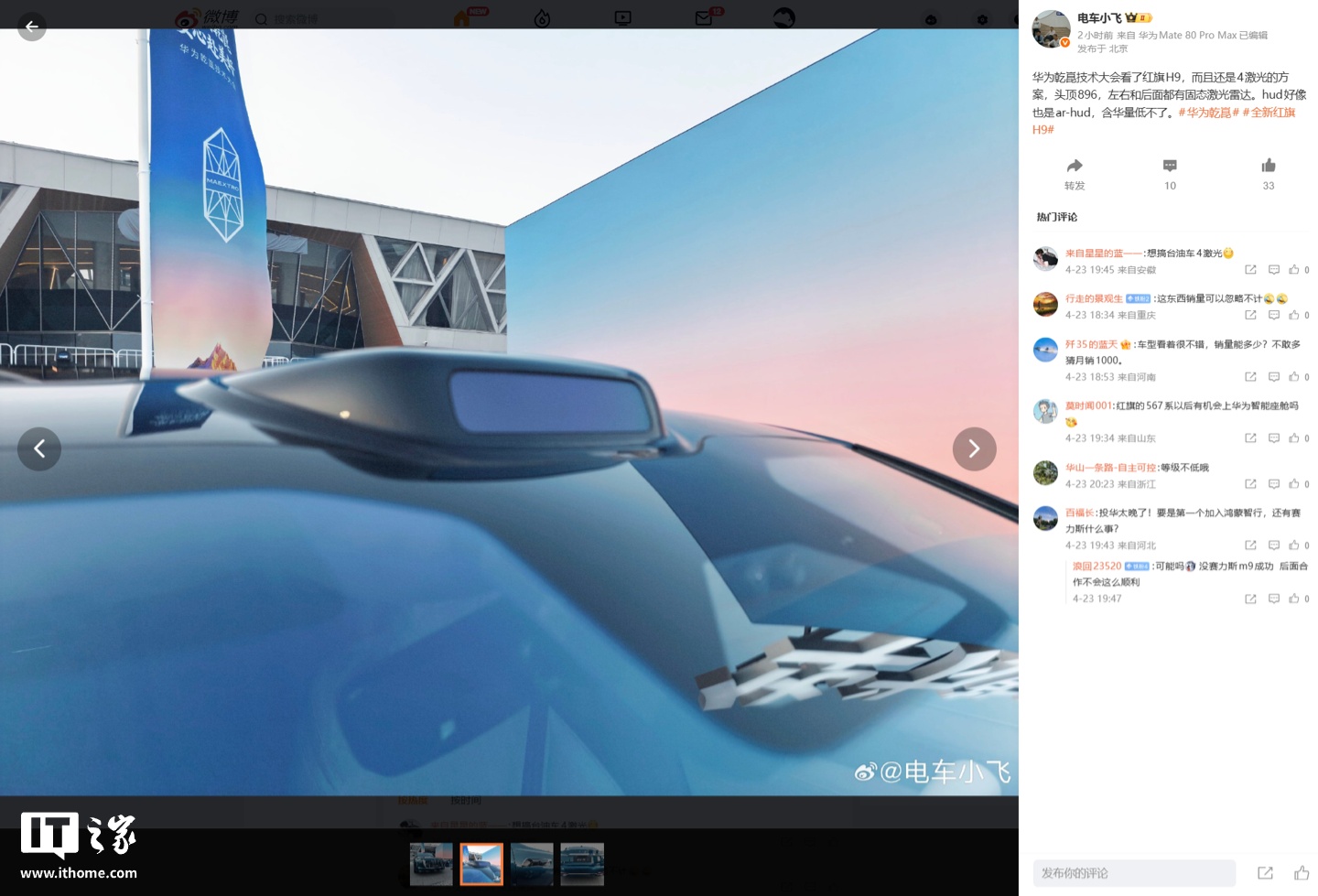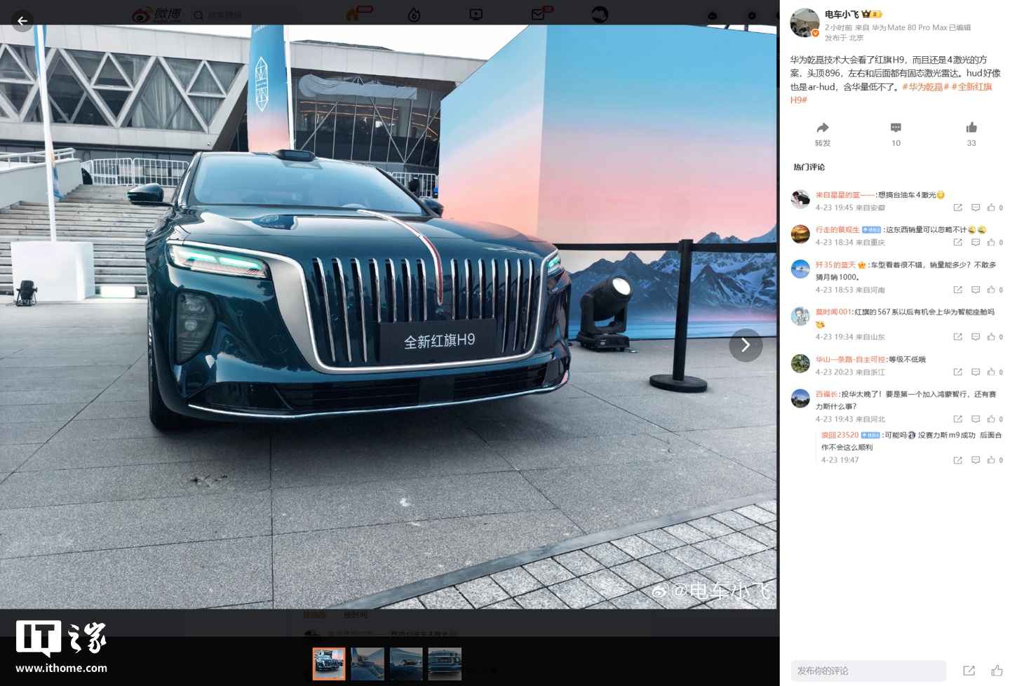 4月23日,华为乾崑技术大会期间,全新红旗H9智能猎装车和奕境X9旗舰SUV亮相。据博主@电车小飞分享,全新红旗H9采用4激光方案,车顶配备华为乾崑896线激光雷达,左右和后面均配备固态激光雷达,并搭载AR-HUD技术。此外,新车还装载了智驾小蓝灯,车头、后视镜和车尾位置共有至少6颗小蓝灯。