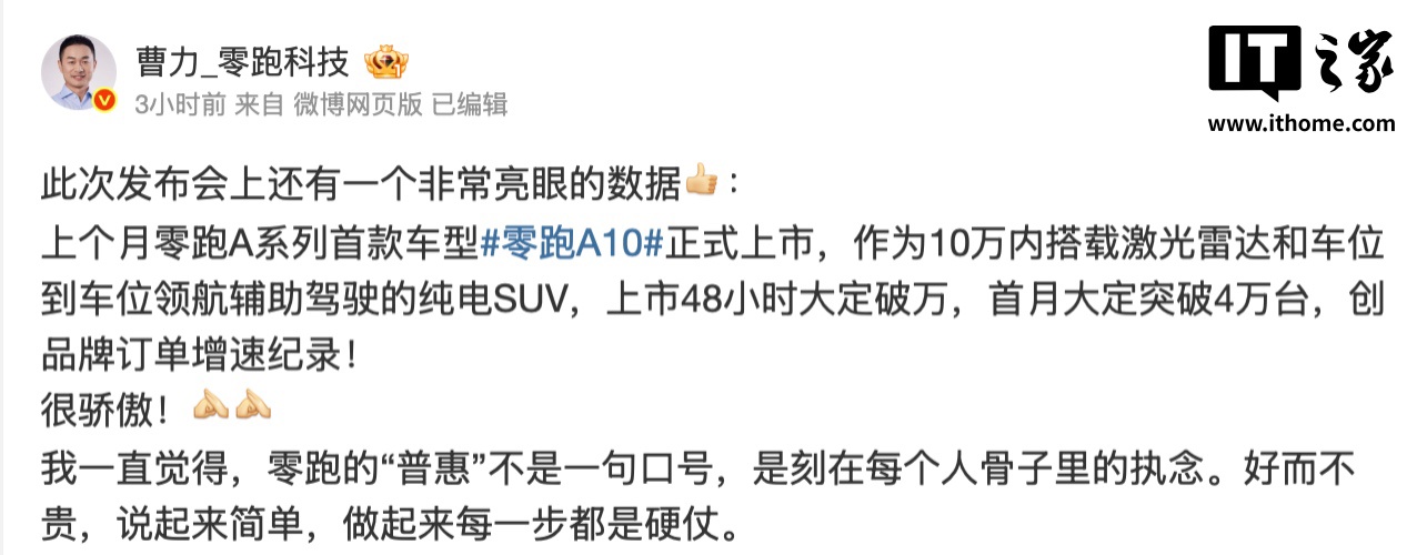 北京车展上宣布,零跑A10自上市以来表现强劲,48小时内大定订单破万,首月(上市28天)大定订单突破4万台,创下品牌订单增速新纪录。零跑A10于3月26日上市,提供四款配置,售价从6.58万元起,包括403舒享版、403悦享版、505悦享版和505激光雷达版。